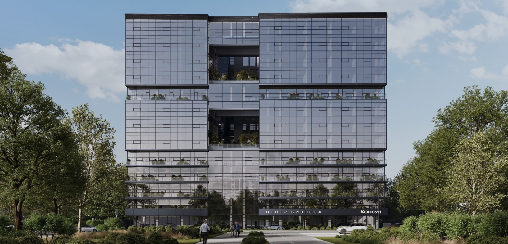 Главный вход расположен по центру, подчеркнут остеклением первого этажа и акцентной вывеской «Центр бизнеса Консул». Широкая парадная аллея с благоустройством и озеленением направляет поток посетителей прямо к входу, формируя продуманную, презентабельную входную группу.
