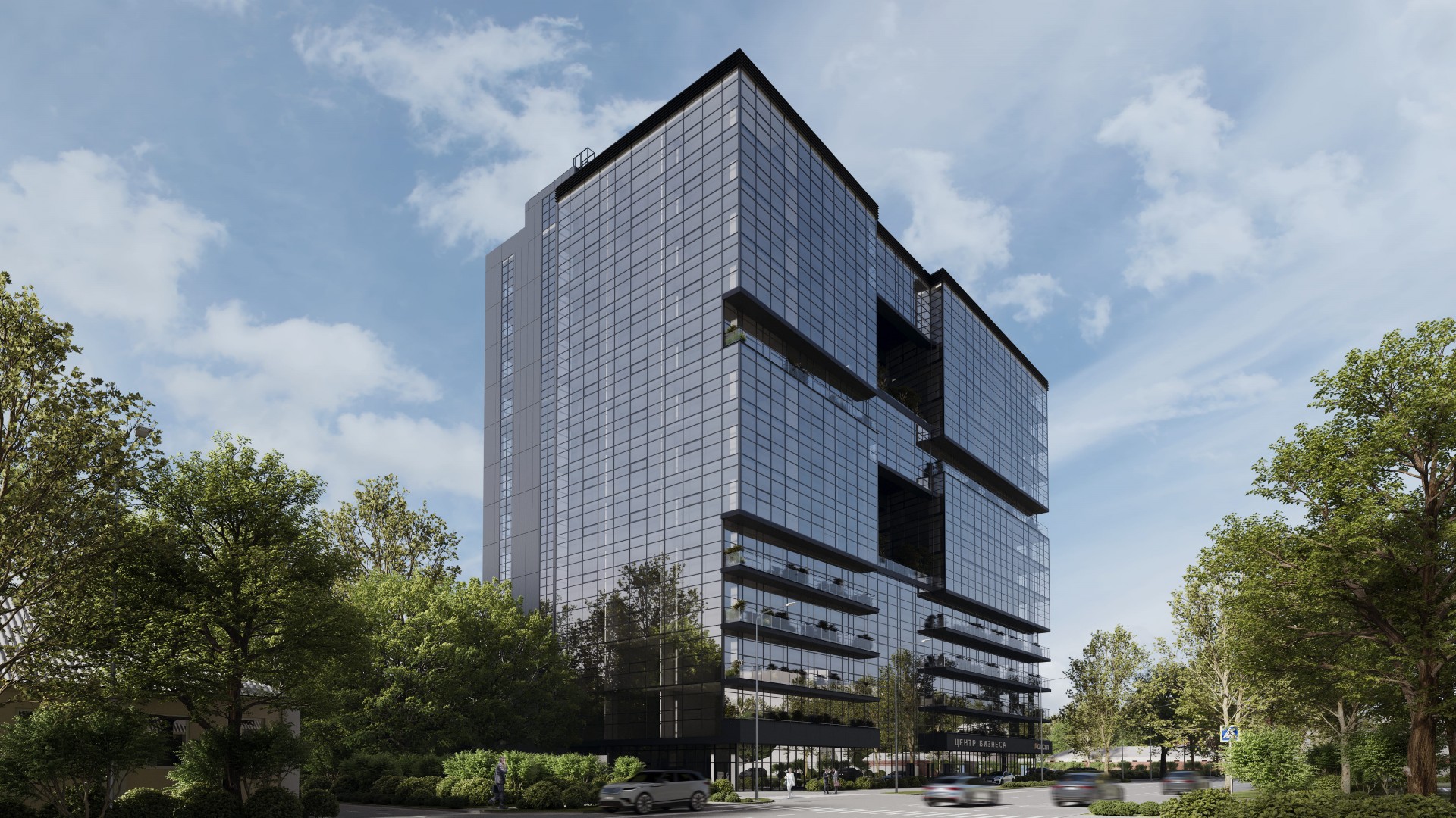 Здание из стекла с минималистичными черными рамами, что подчеркивает строгость и статус комплекса. Использование панорамного остекления придаёт сооружению лёгкость, визуальную прозрачность и создаёт ощущение открытости, одновременно обеспечивая отличную инсоляцию внутренних пространств.
