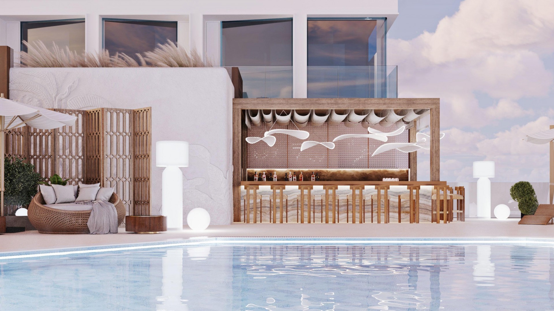 Наша команда разработала проект бассейного комплекса, учитывая уникальные особенности и требования заказчика. Основной сложностью стало расположение технического блока, который перекрывал панораму на внутренний двор. Мы стремились создать дизайн, позволяющий посетителям наслаждаться видом на озелененный внутренний двор отельного комплекса.