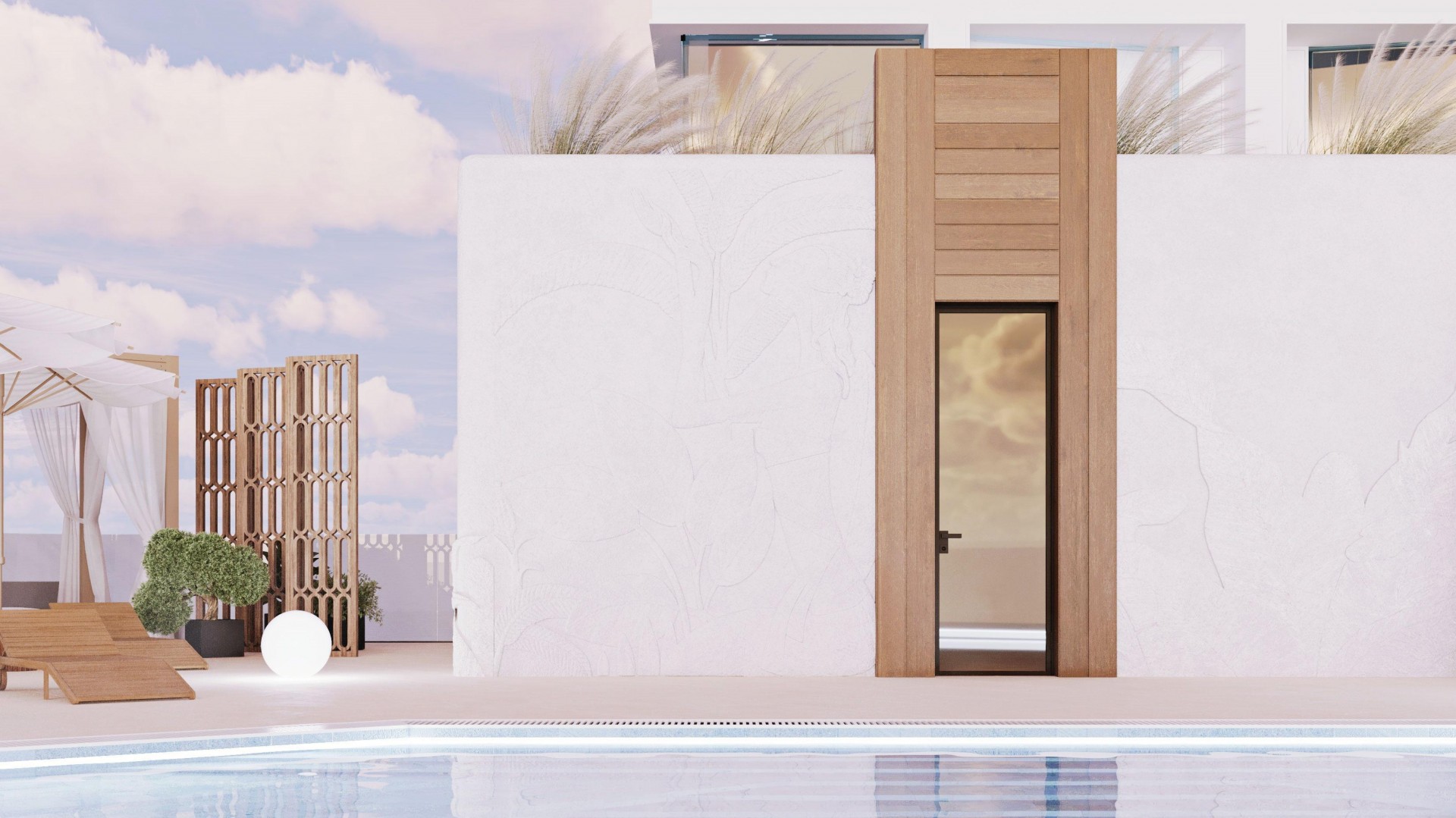 Для достижения желаемого результата мы произвели перепланировку помещений. Технический блок был перемещен вправо, а зона для гостей – влево, если смотреть из внутреннего двора. Бассейн был размещен в центре, что обеспечило отличную визуальную симметрию и свободный обзор.