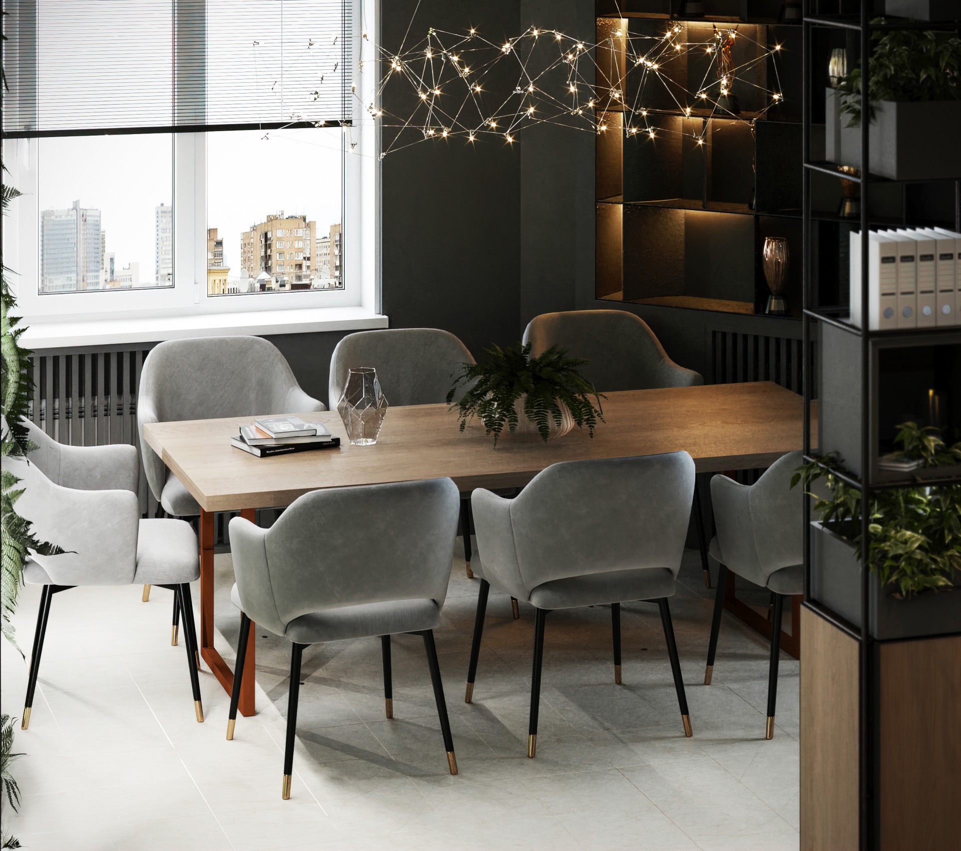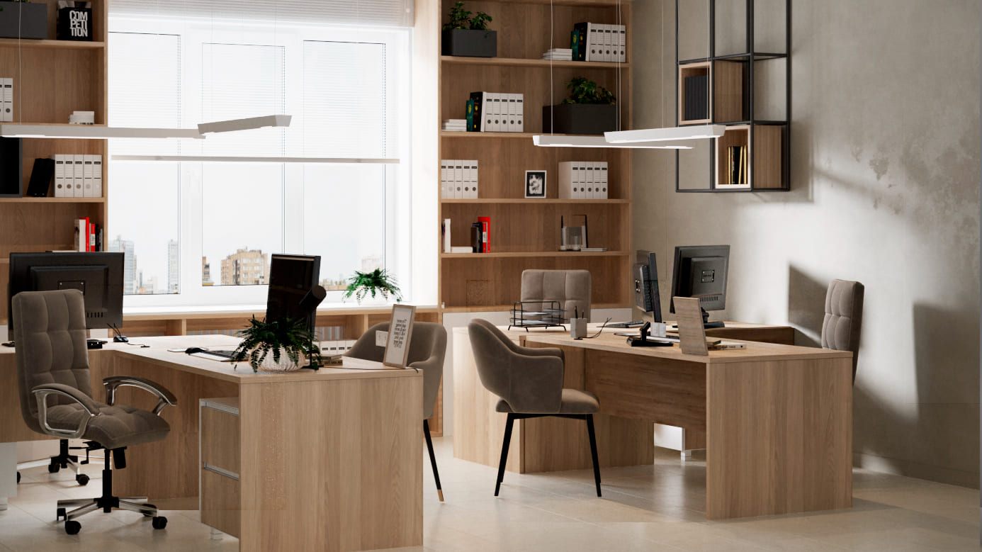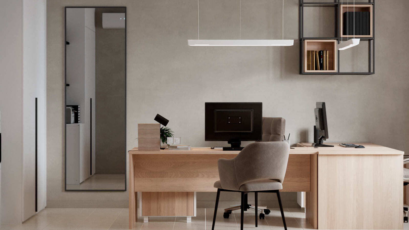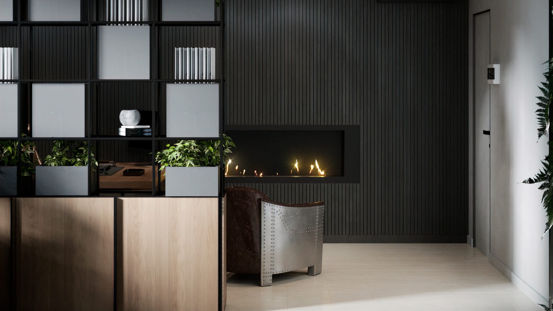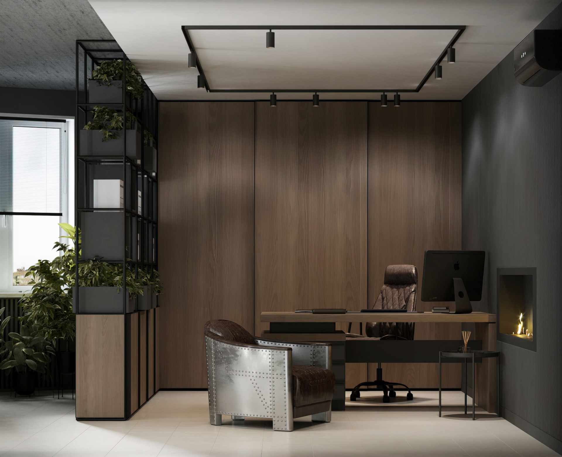 Мы предусмотрели цветовые различия между этими помещениями, несмотря на сохранение общего стиля. Так, например, зона персонала выполнена преимущественно в светлых оттенках, а кабинет для руководителя в темных – насыщенный серый, черный, декоративный бетон. В дизайне использованы премиальные материалы и современные элементы декора. Кабинет выполнен в строгом, но элегантном стиле, что создает атмосферу профессионализма и комфорта.