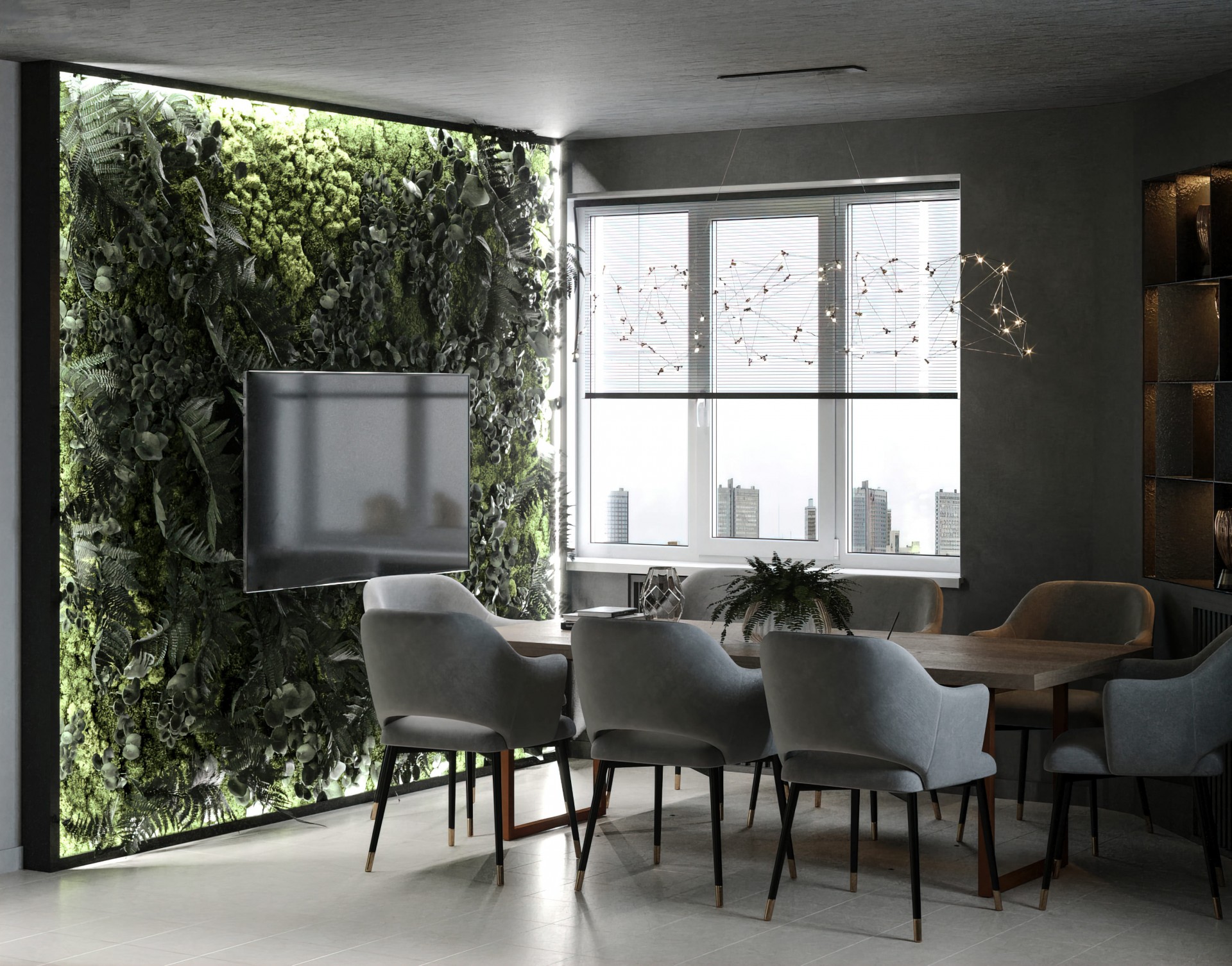 Помещение главы компании имеет несколько ярких акцентов. Одним из них является фитостена, которая отлично вписывается в различные направления интерьера.