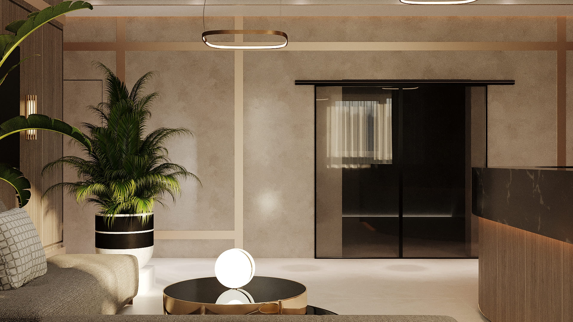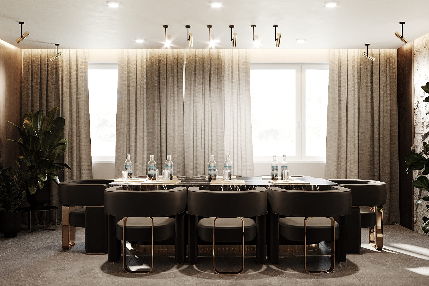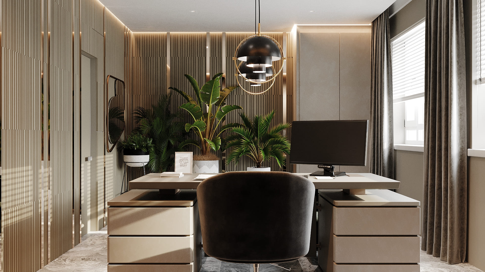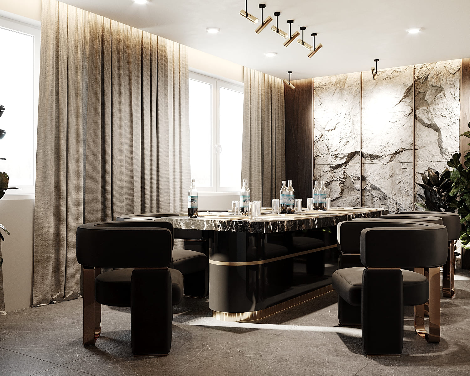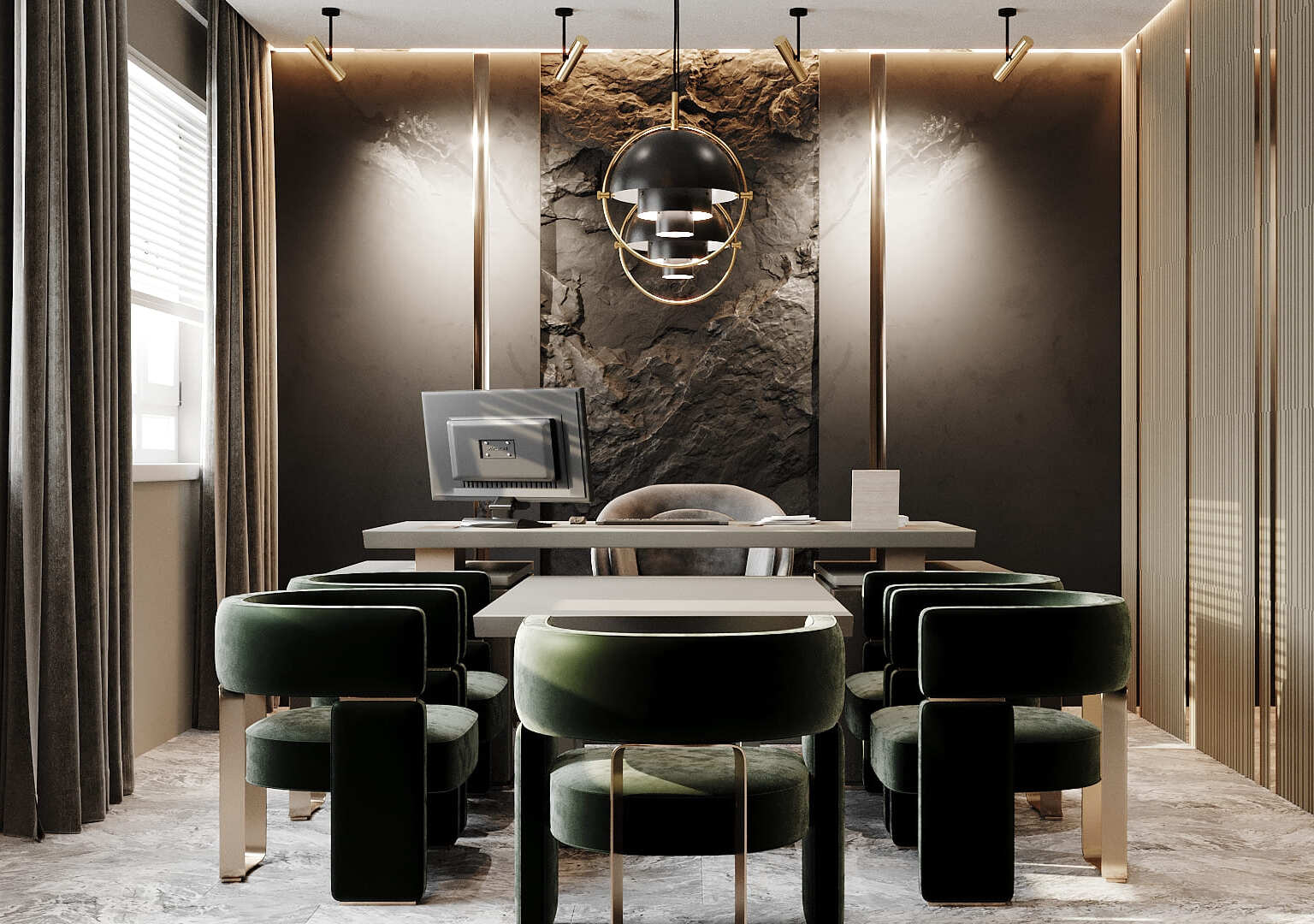 Зона руководства выполнена из материалов класса премиум и люкс: полы пробка, стены мдф панели с натуральным шпоном и декоративная штукатурка с молдингами, двери скрытого монтажа, потолки гипсокартон с многообразием световых сценариев, шторы и декоративные панели завершают интерьер. Мебель заложена эксклюзивная, производится под заказ.
