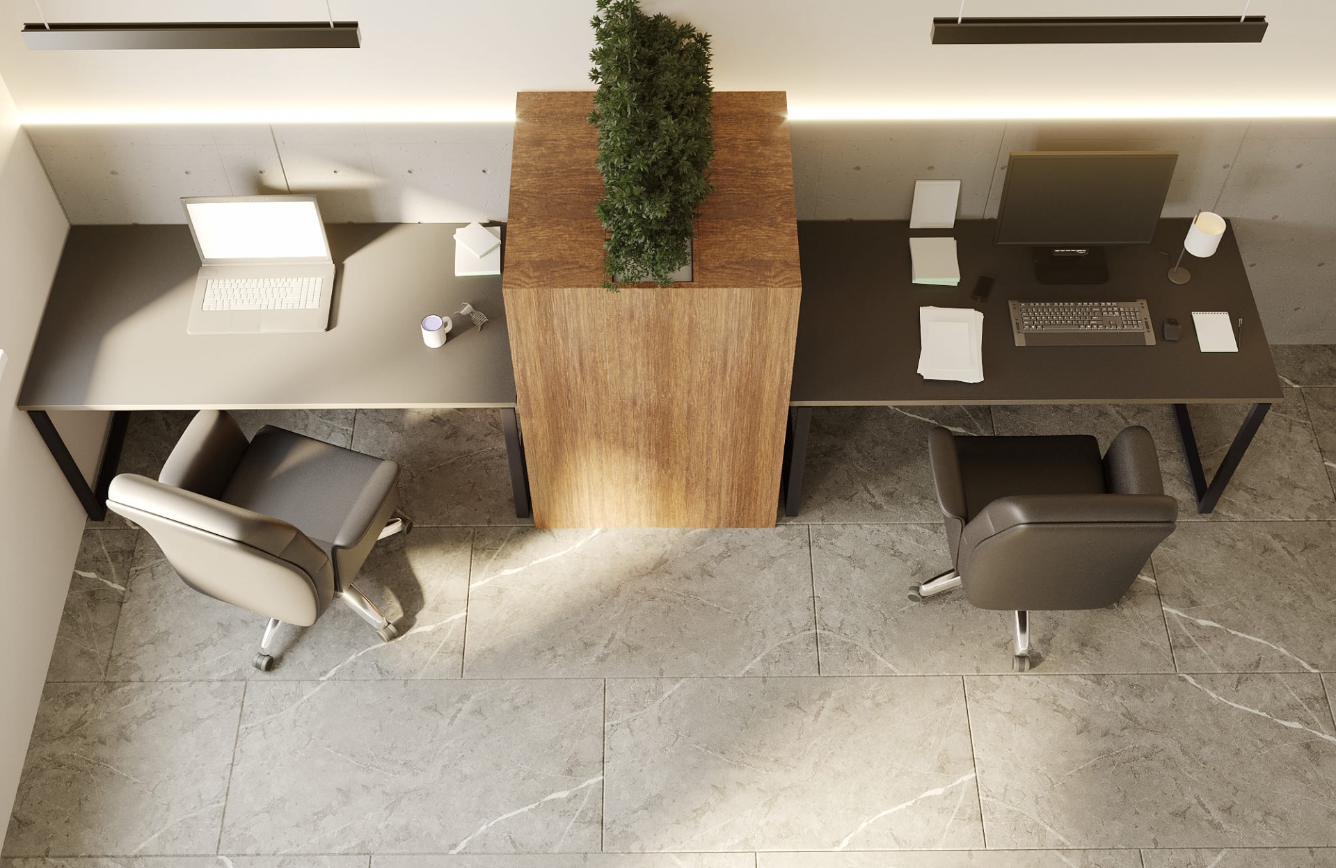 Таким образом, помещение необходимо было разделить на зону высшего руководства, среднего менеджмента и рядовых сотрудников, при этом сохранить основную стилистическую линию.