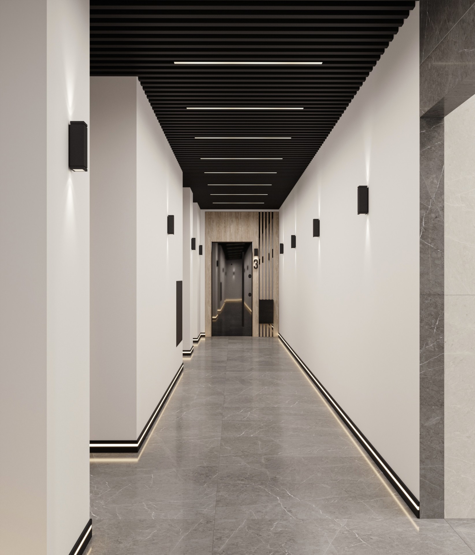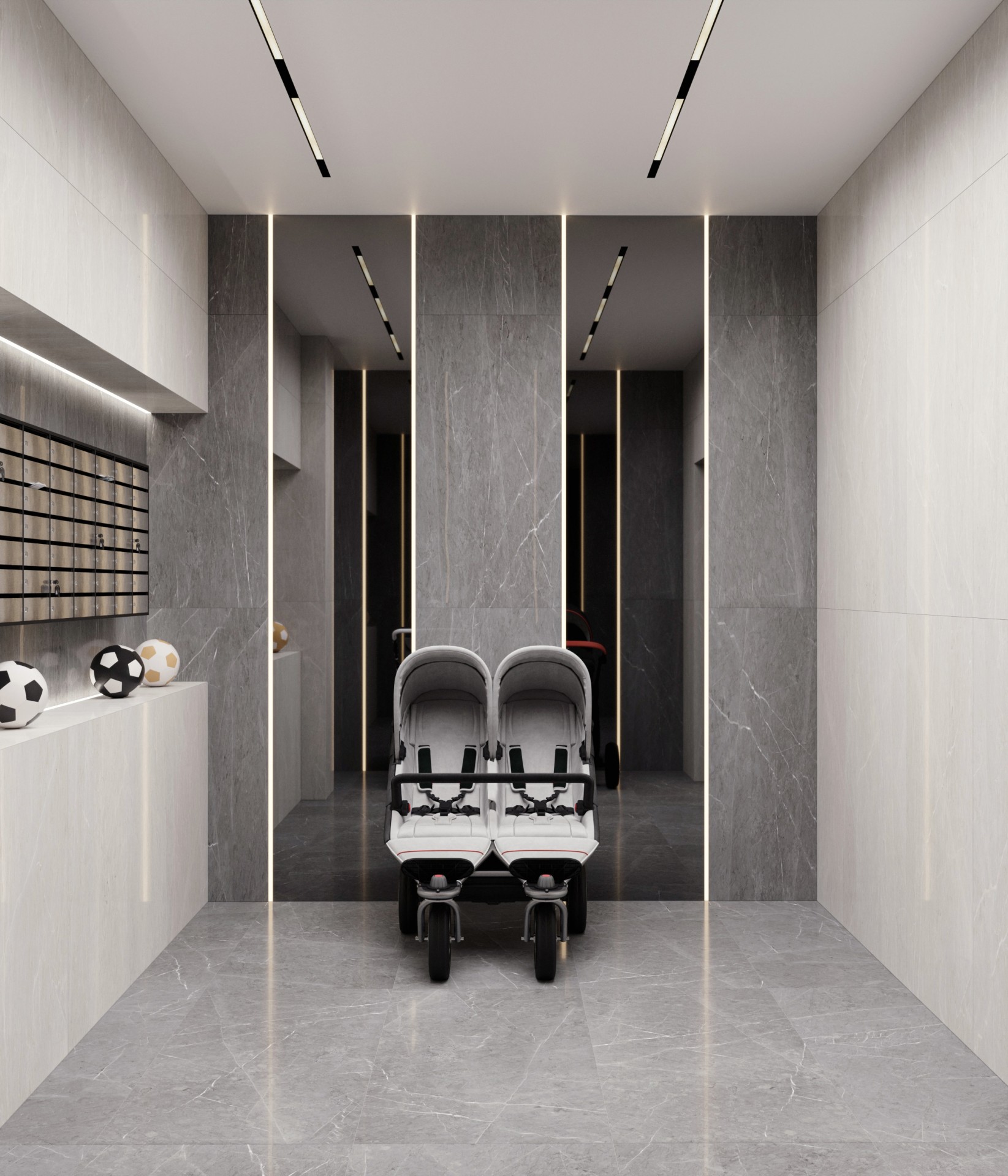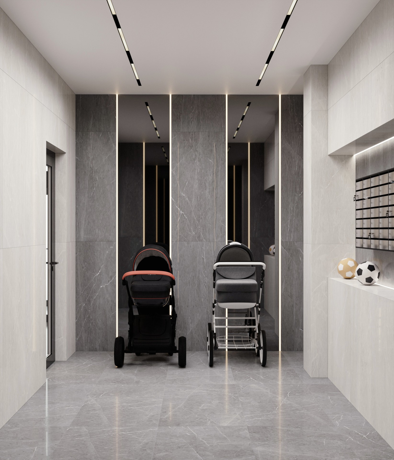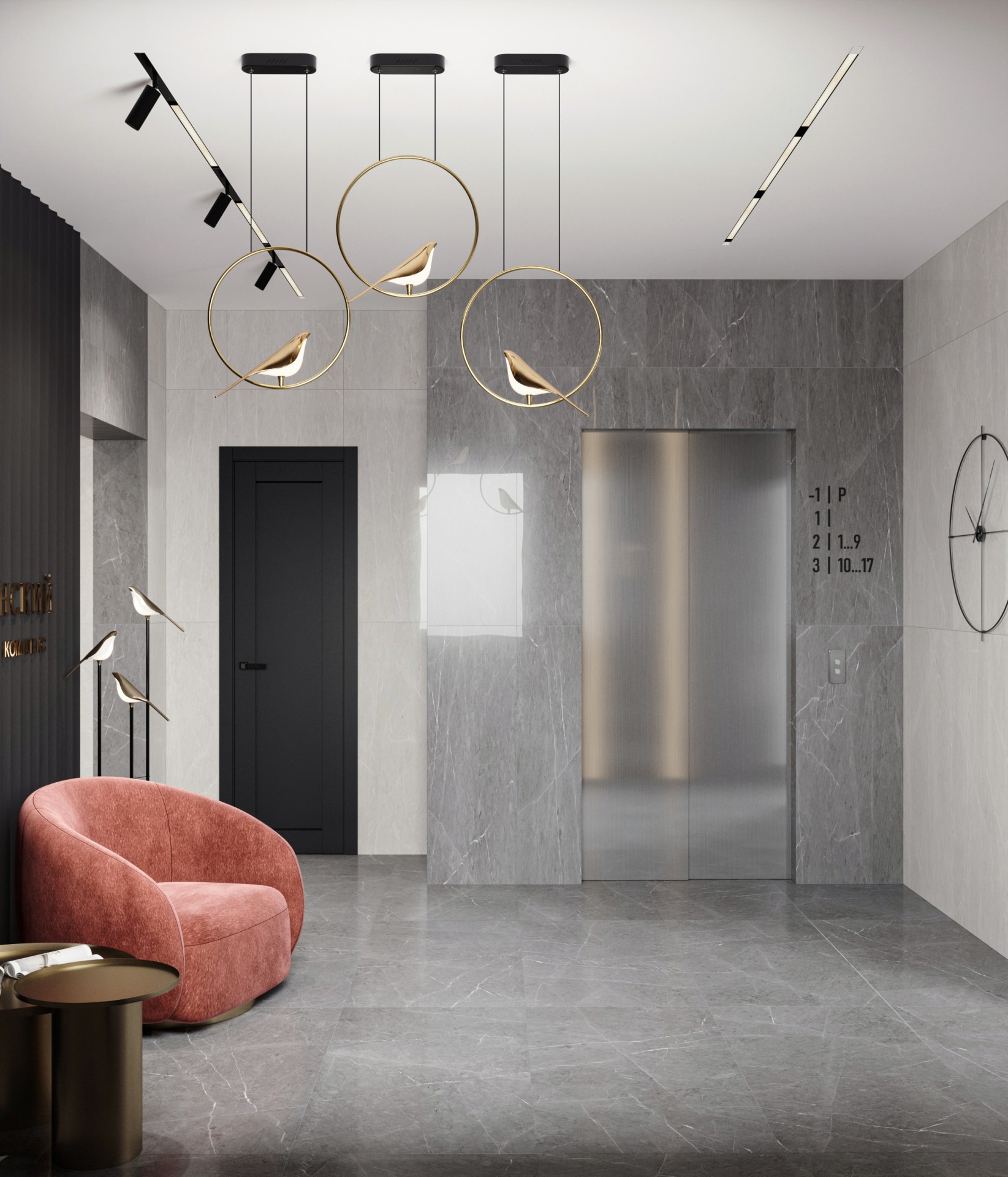 Наш дизайн-проект для застройщика направлен на создание уникального и комфортного пространства в местах общего пользования. Основная идея проекта – сочетание контрастных цветов и текстур, что придает пространству современный и стильный вид. В качестве основного материала для отделки мы выбрали керамогранит, что подчеркивает статус и качество объекта.