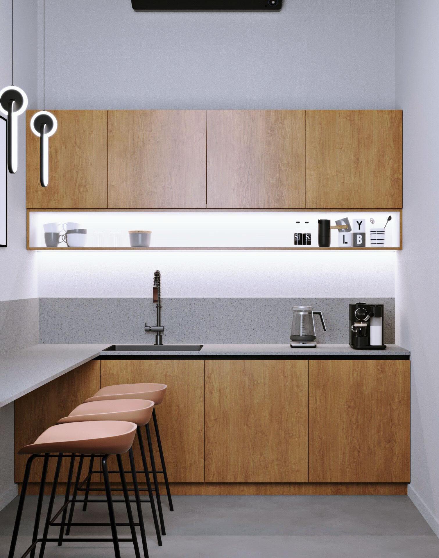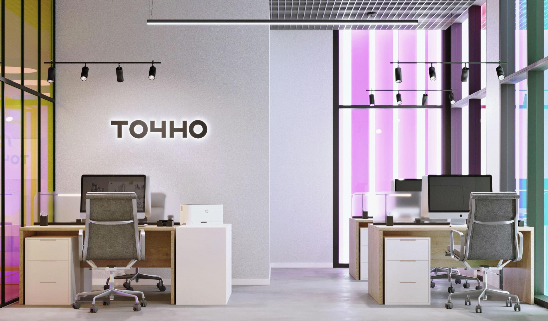 Акцент в интерьере был сделан на использовании диахронического стекла в виде перегородок между рабочими пространствами. Этот материал был выбран за его способность создавать интересные визуальные эффекты и игру света. Чтобы не перегружать интерьер, остальная часть дизайна была выполнена в спокойной палитре с использованием минималистичных и понятных материалов.