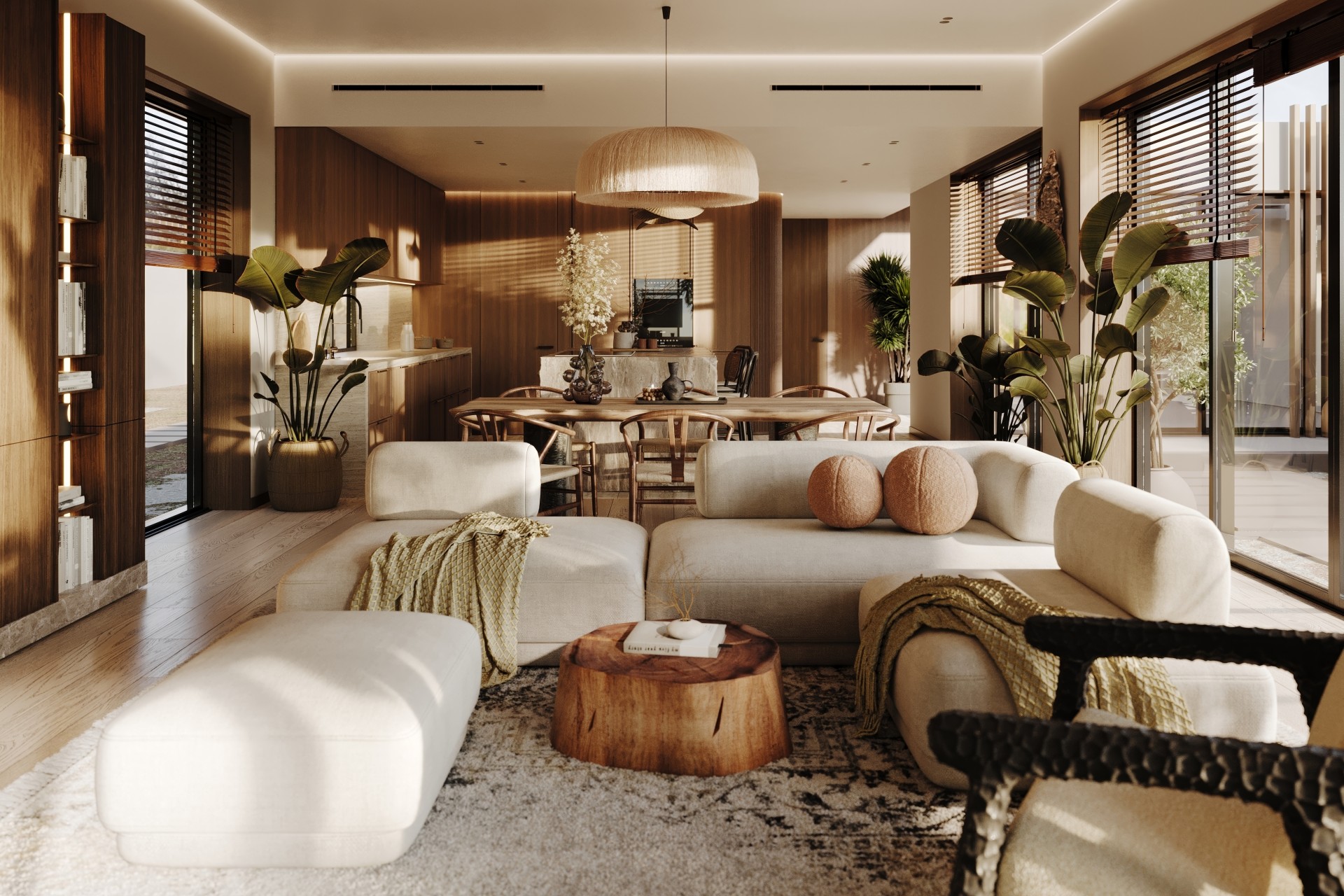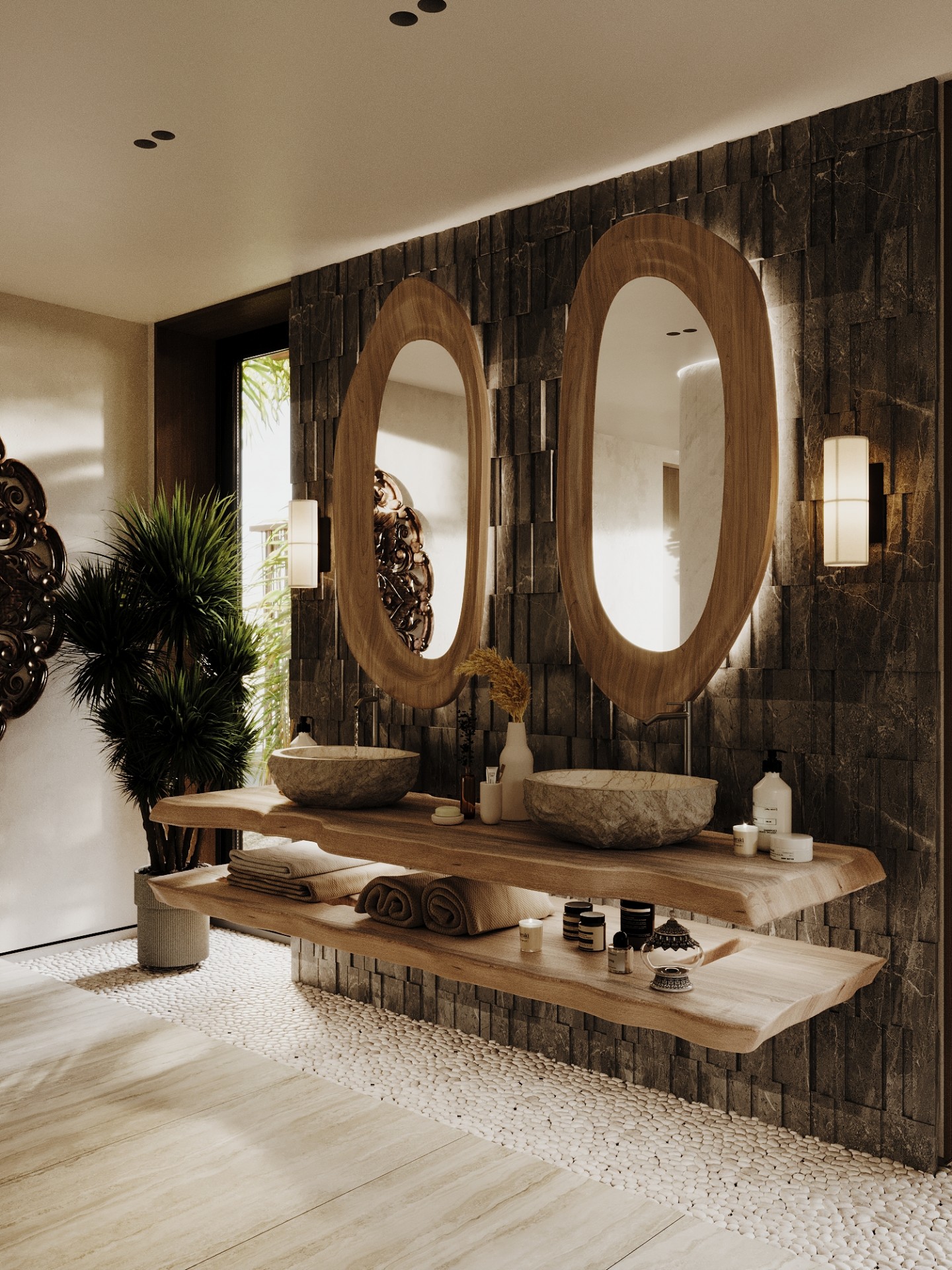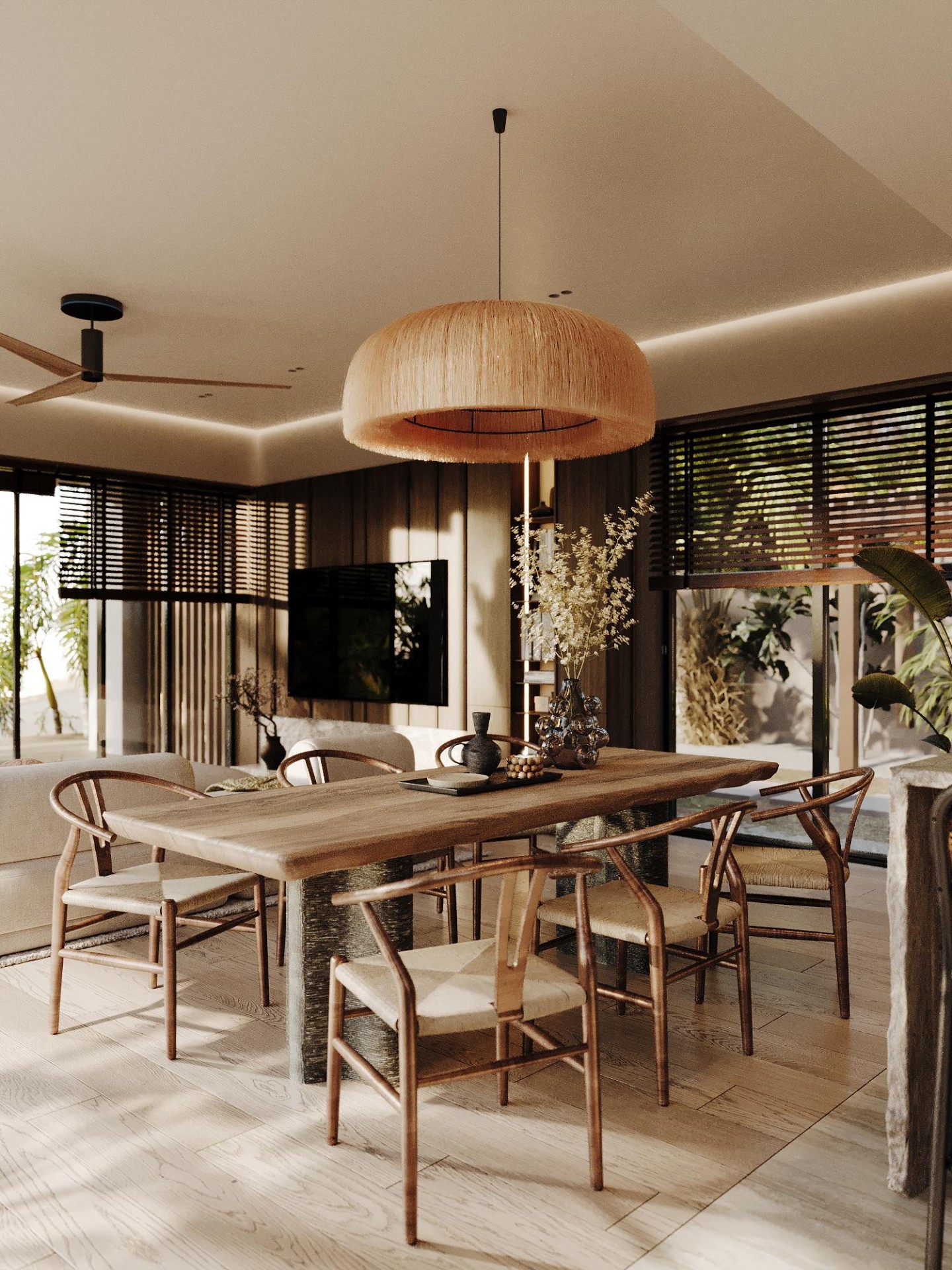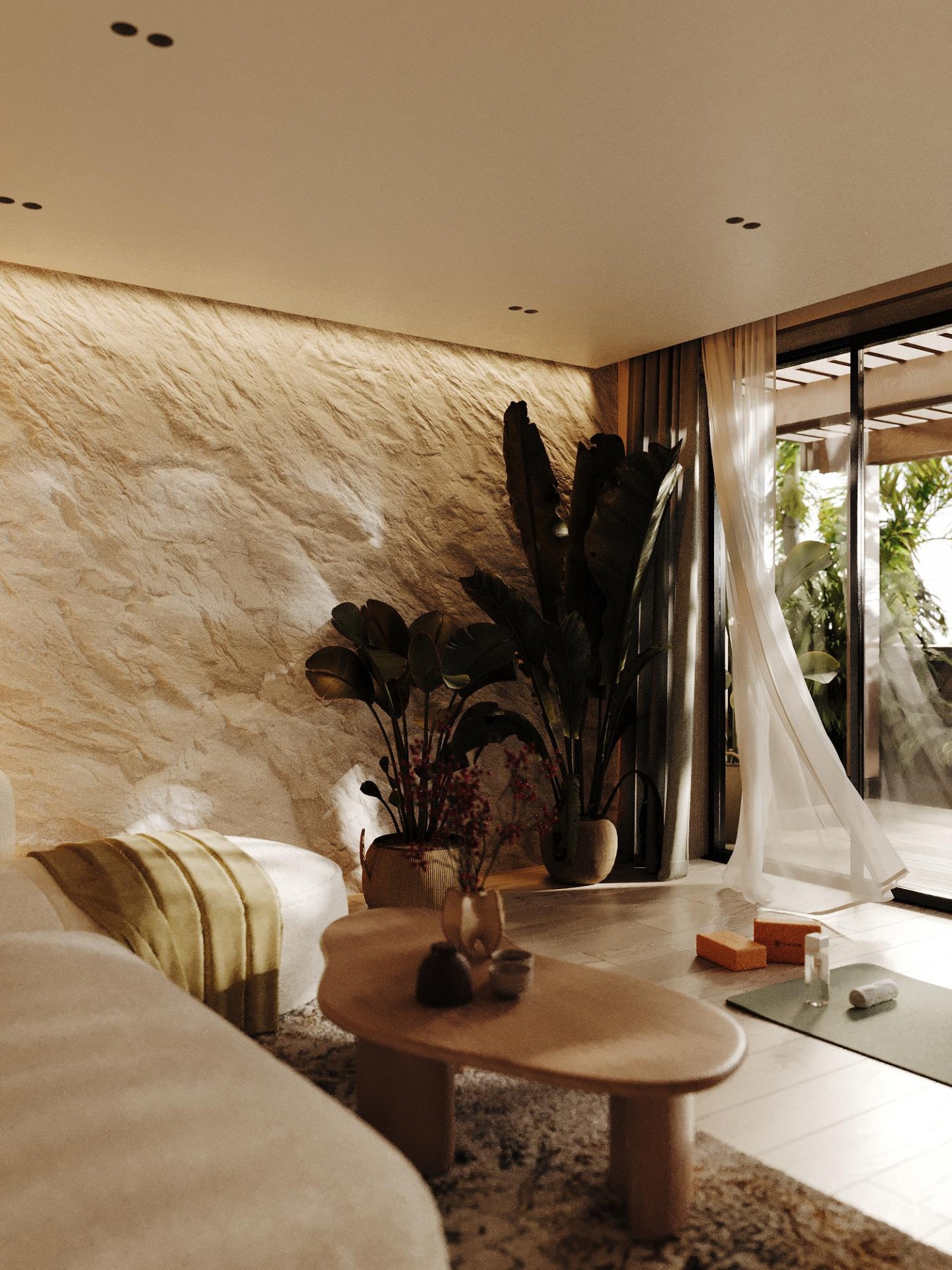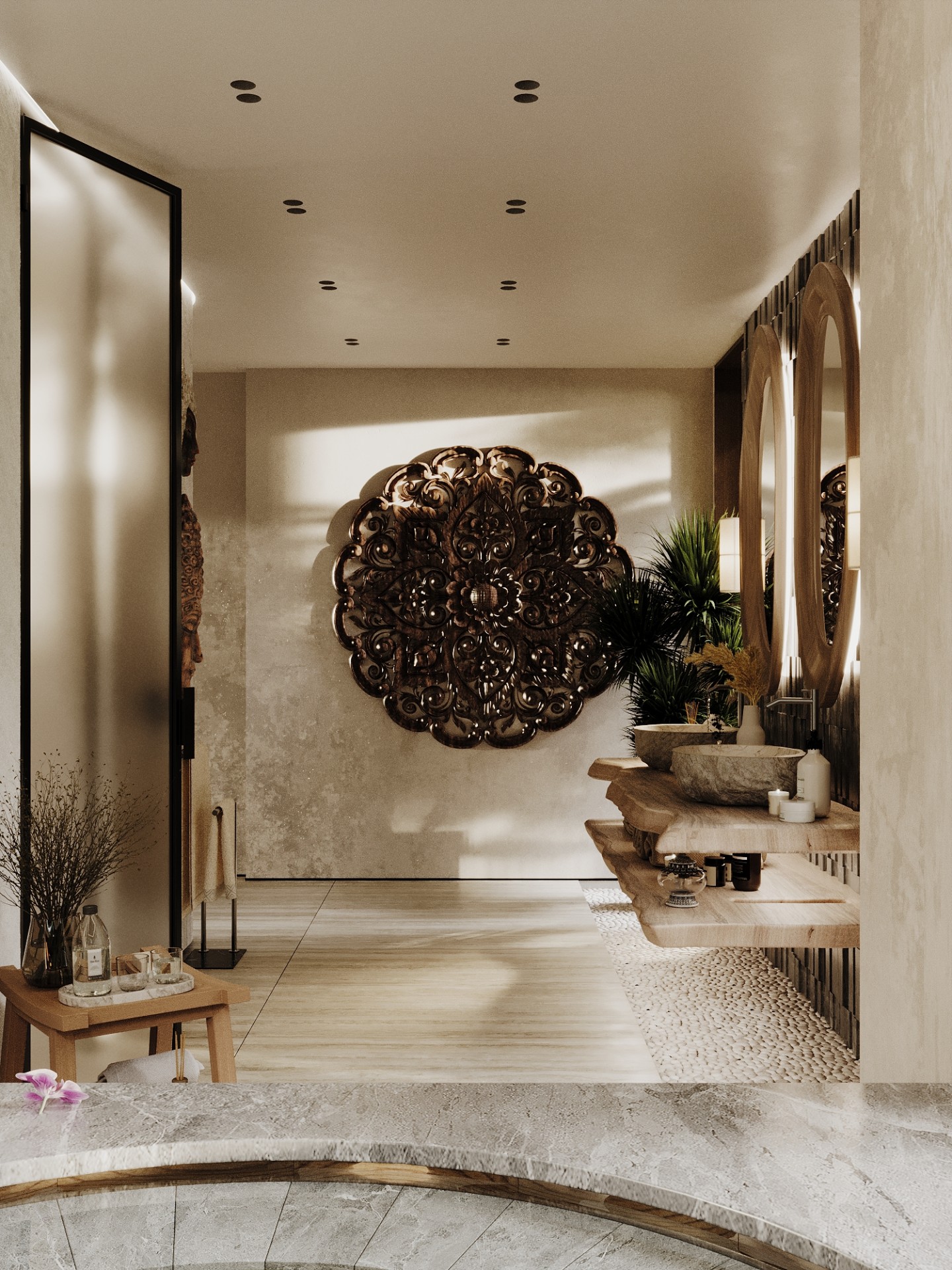 Просторные и светлые помещения оформлены с уважением к природе, а элементы декора, такие как стильные статуэтки Будды и ручной работы ковры, привносят в интерьер атмосферу внутреннего спокойствия и гармонии. Эти детали создают баланс между роскошью и естественностью, подчеркивая спокойствие и умиротворенность, свойственные этому уникальному уголку природы.