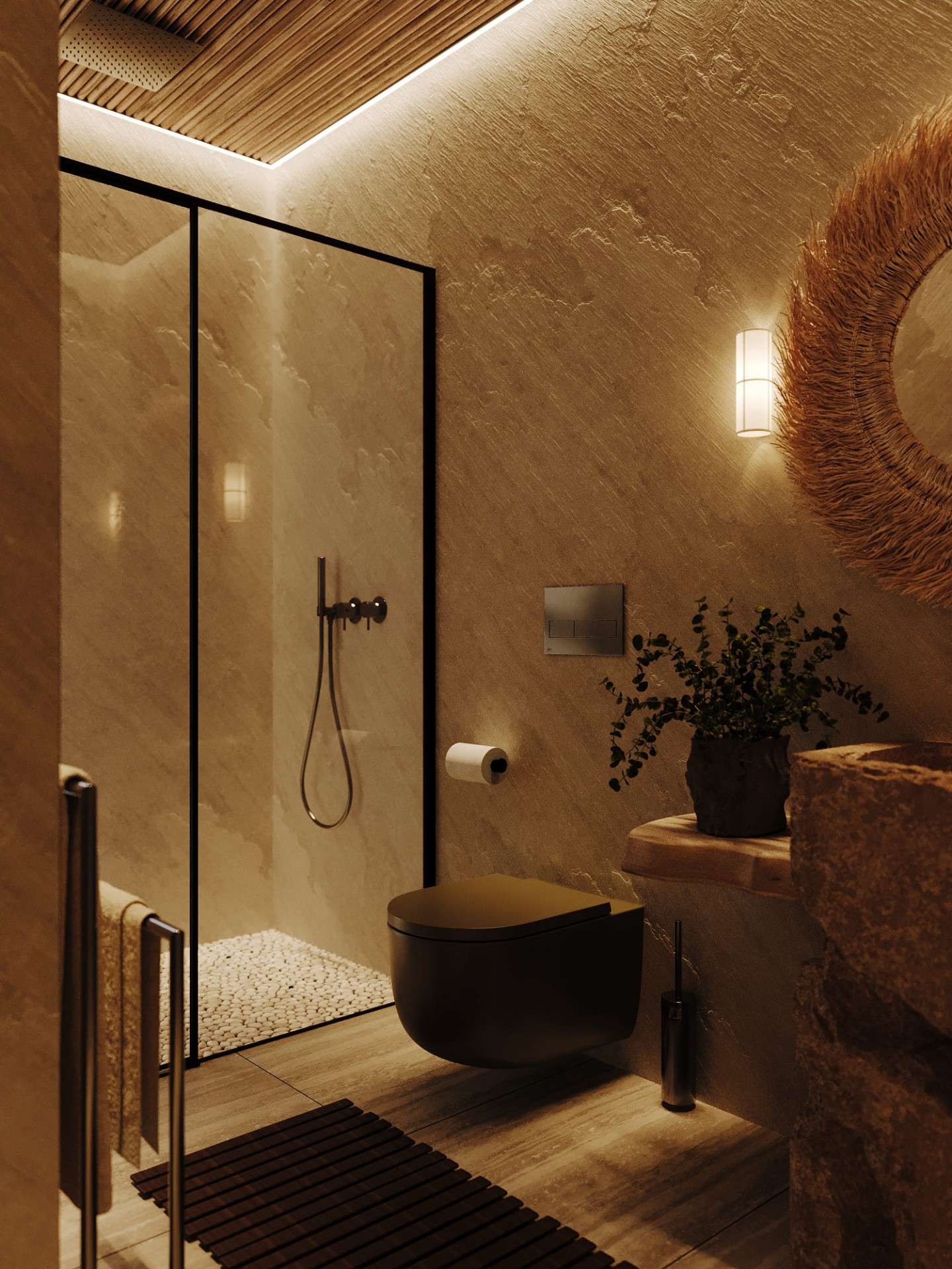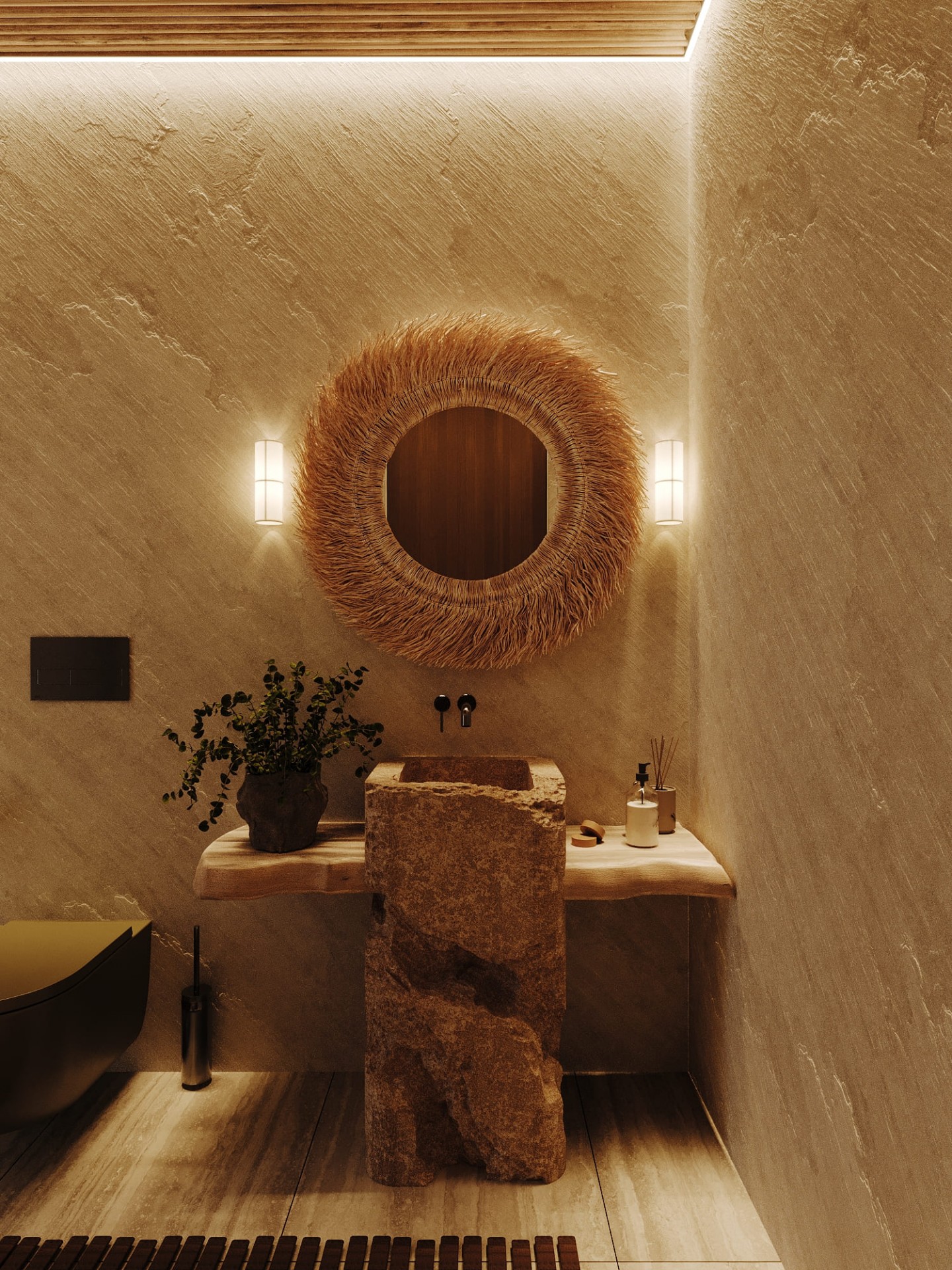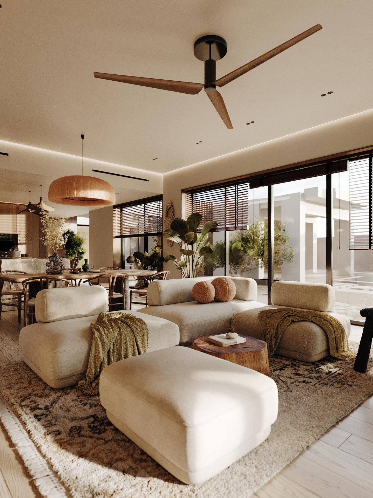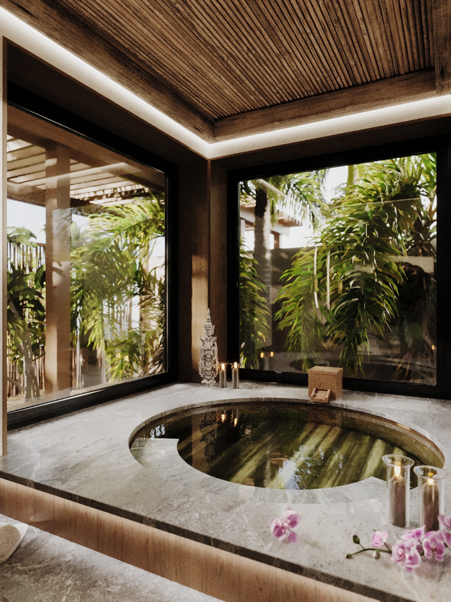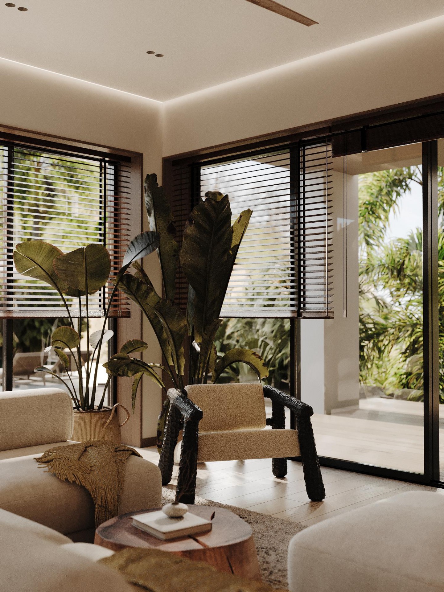 Просторные и светлые помещения оформлены с уважением к природе, а элементы декора, такие как стильные статуэтки Будды и ручной работы ковры, привносят в интерьер атмосферу внутреннего спокойствия и гармонии. Эти детали создают баланс между роскошью и естественностью, подчеркивая спокойствие и умиротворенность, свойственные этому уникальному уголку природы.