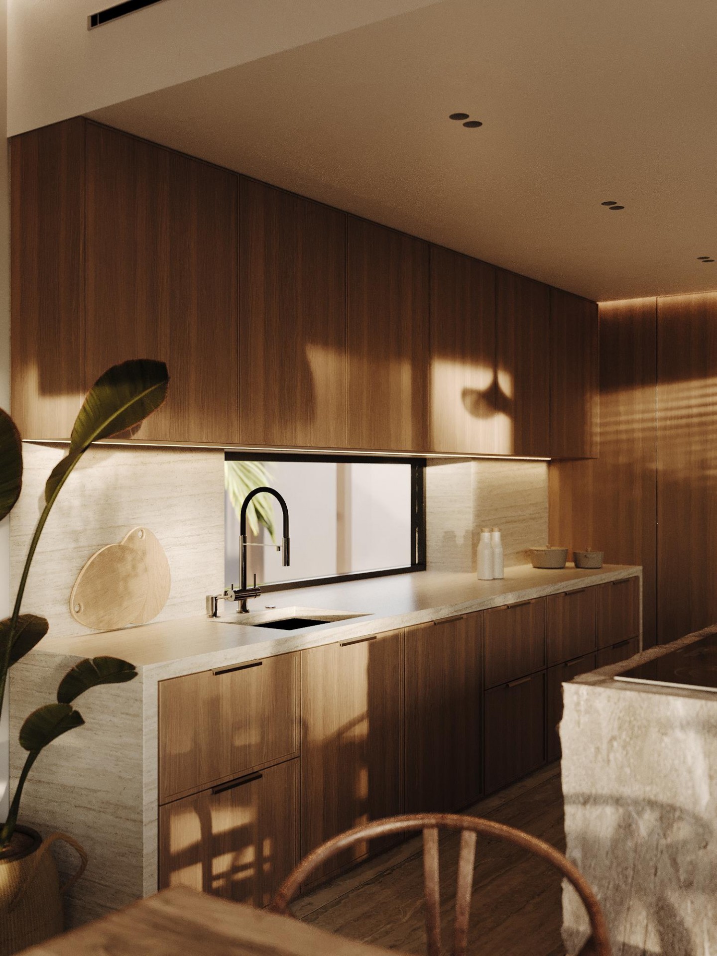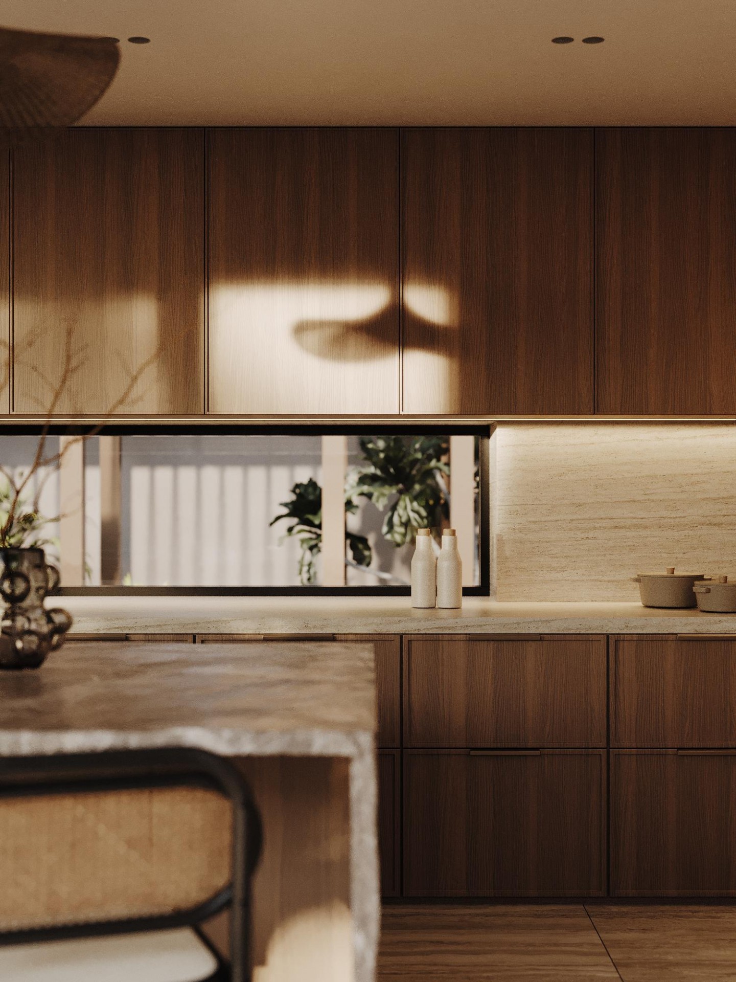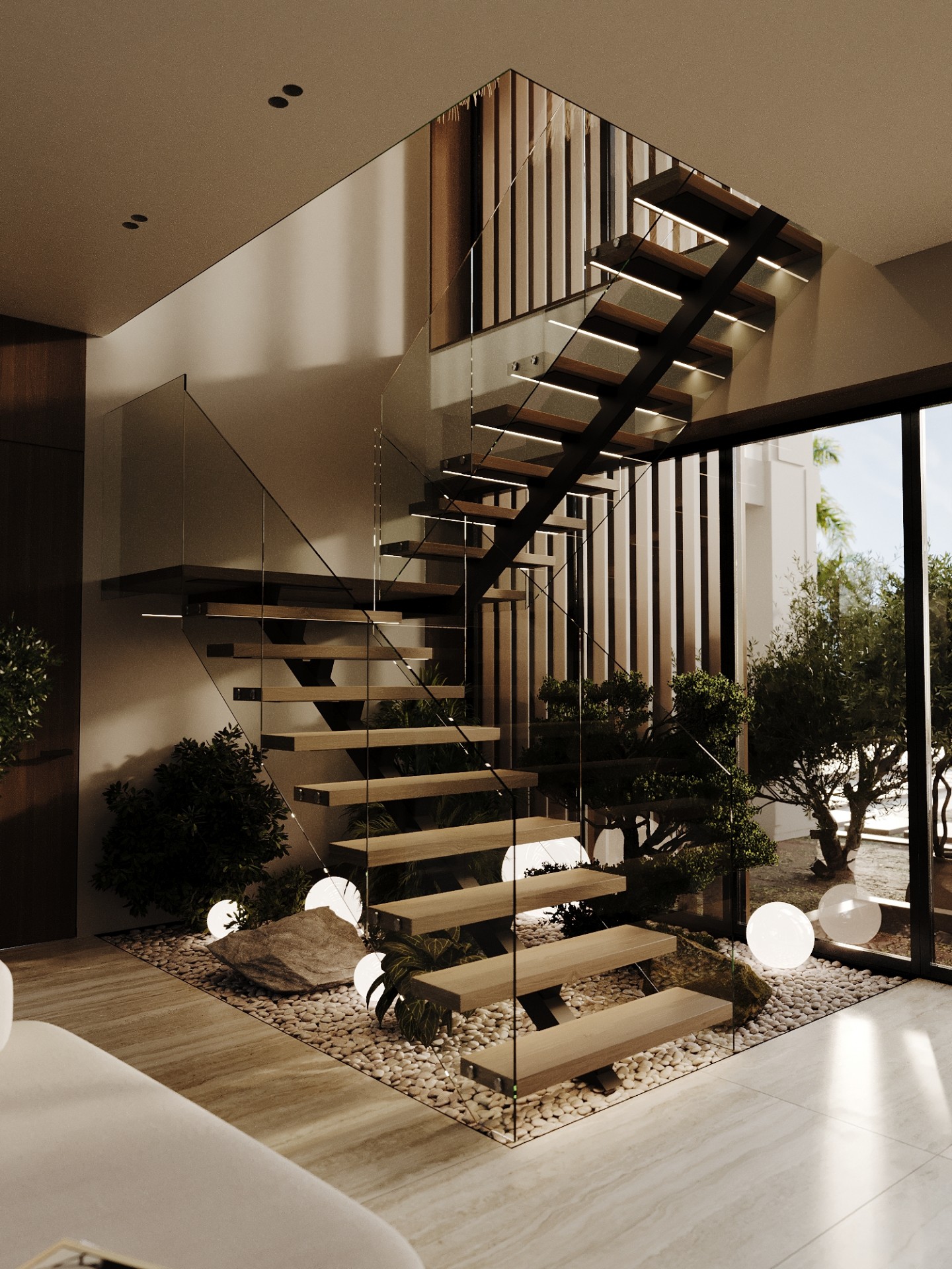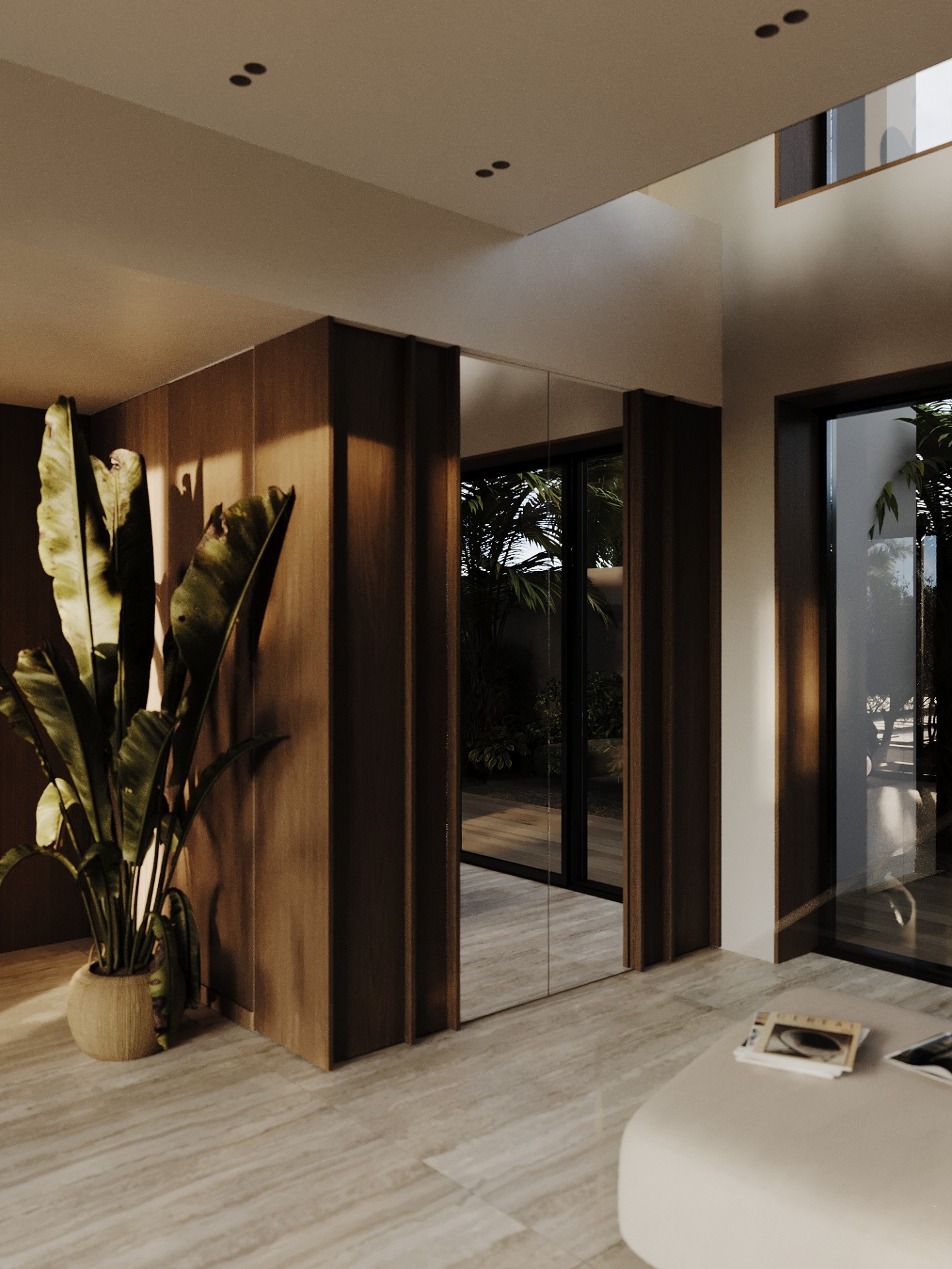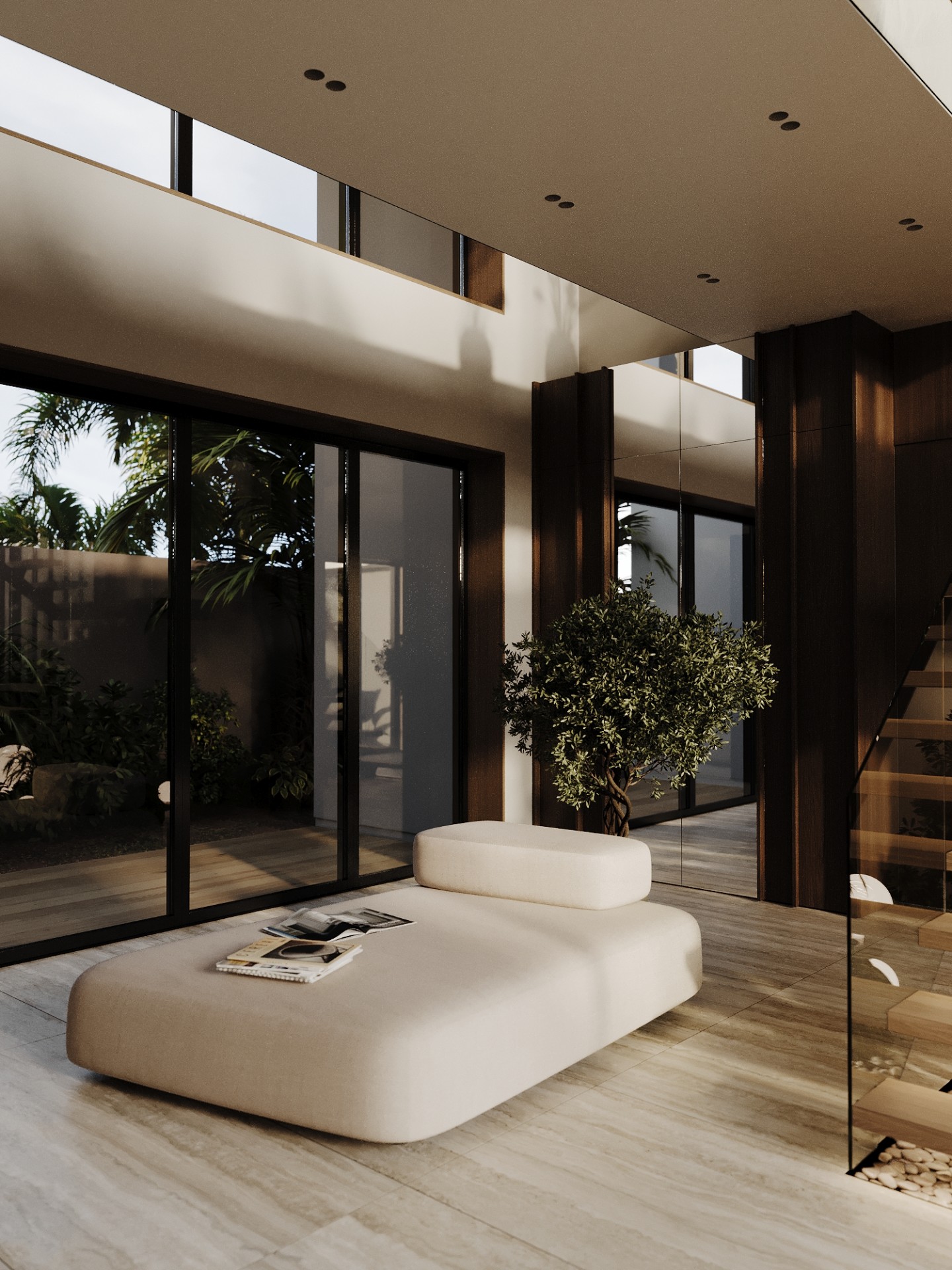 Комфортные текстуры и элементы роскоши, такие как мягкая мебель и зеркала, гармонично сочетаются с видами на побережье, делая интерьер одновременно изысканным и доступным, современным и в то же время природно связанным с окружающим миром.