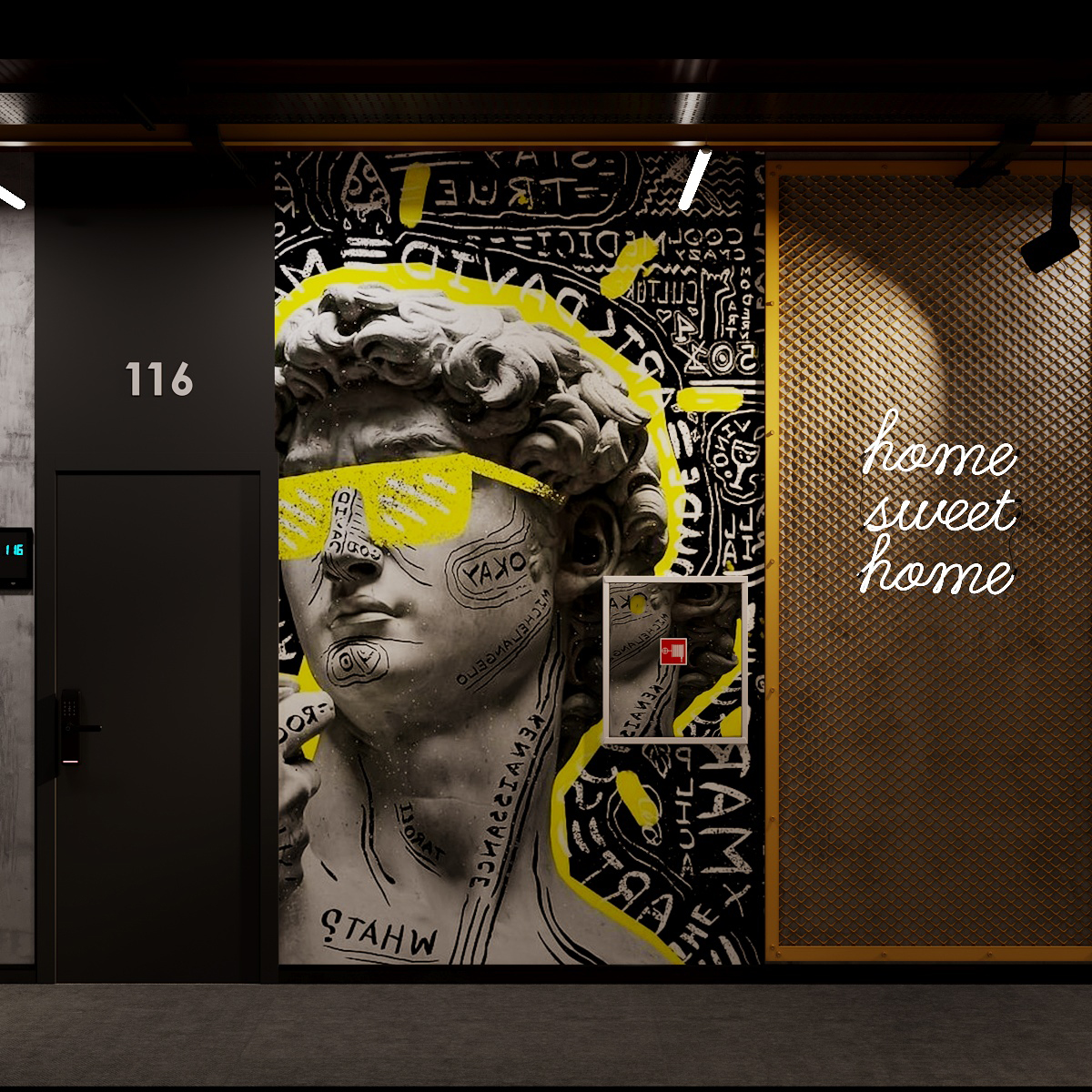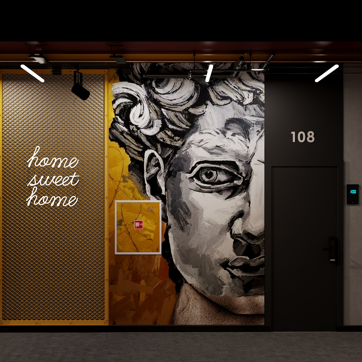 Основное внимание уделено геометрическим формам, вдохновленным природными структурами — сотами и ульями, что символизирует организованность, взаимосвязанность и взаимодействие. Эти элементы не только визуально разделяют пространство, но и олицетворяют идею современного коливинга, где люди живут и работают, взаимно влияя друг на друга и создавая единую гармоничную среду.