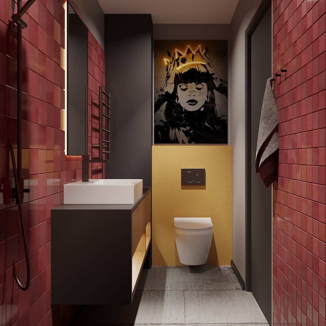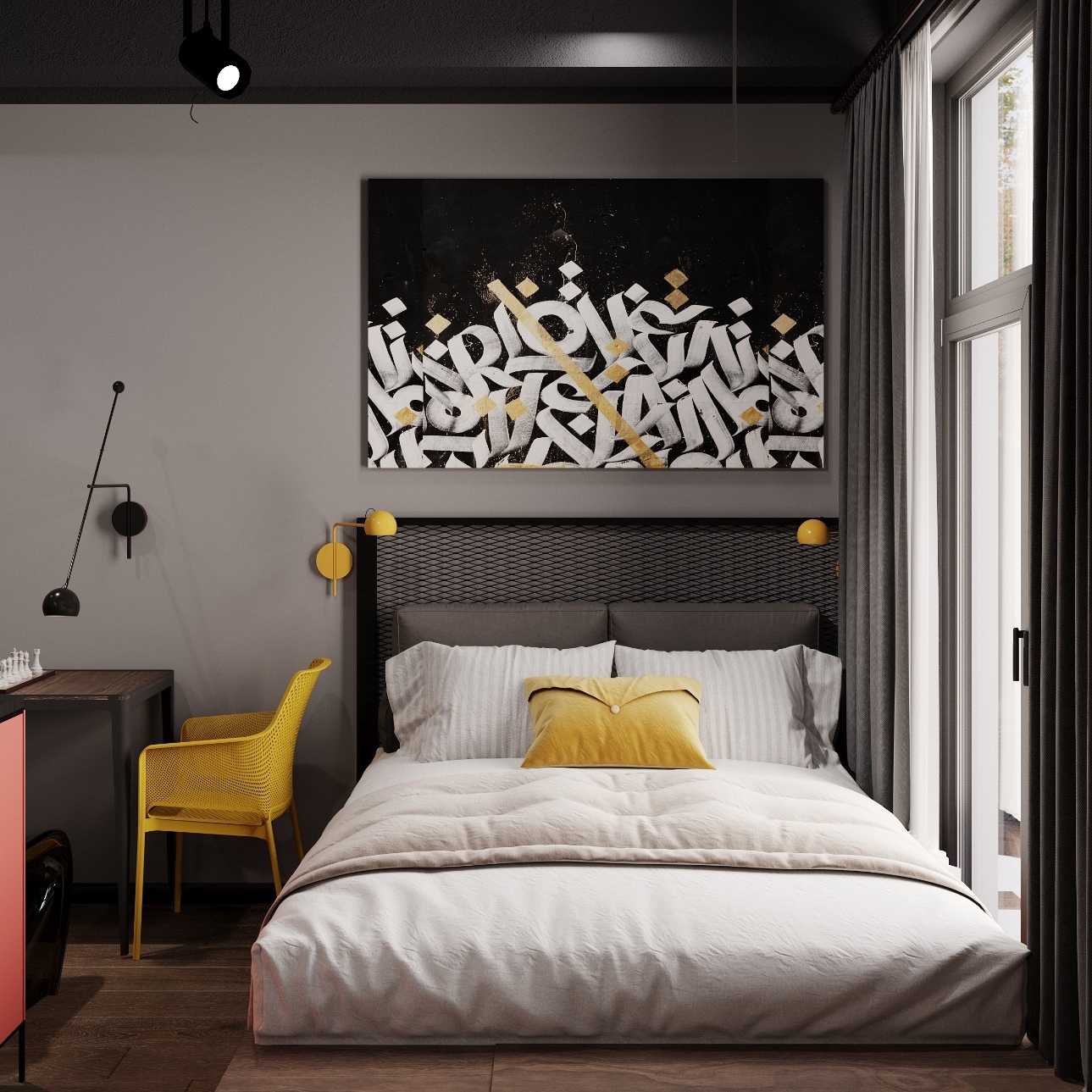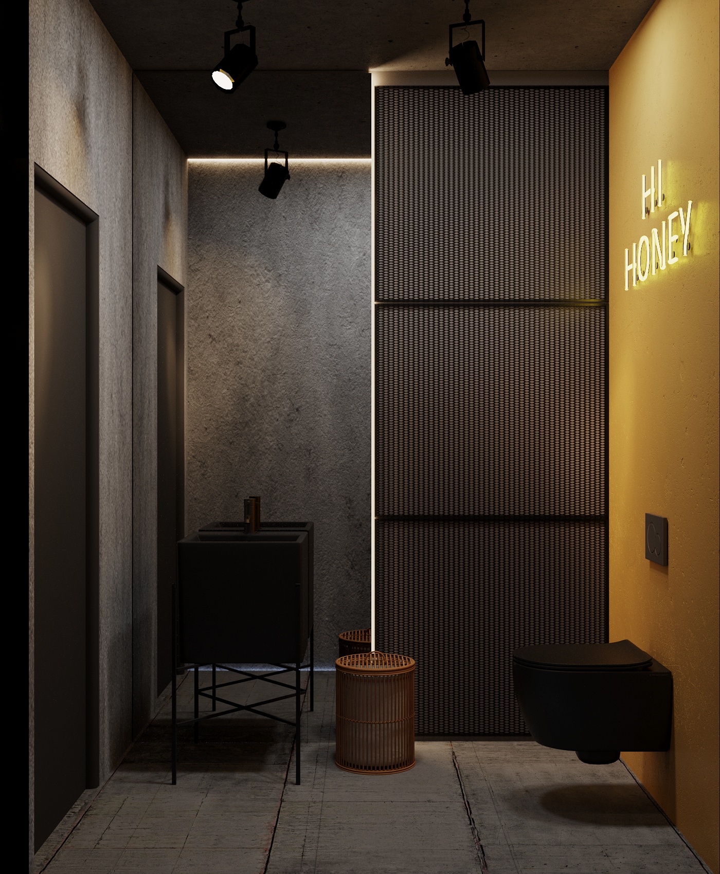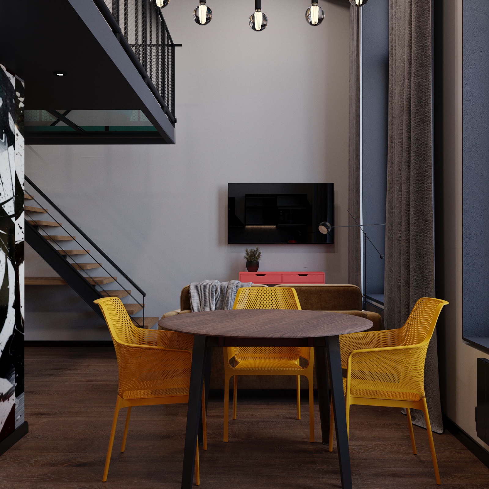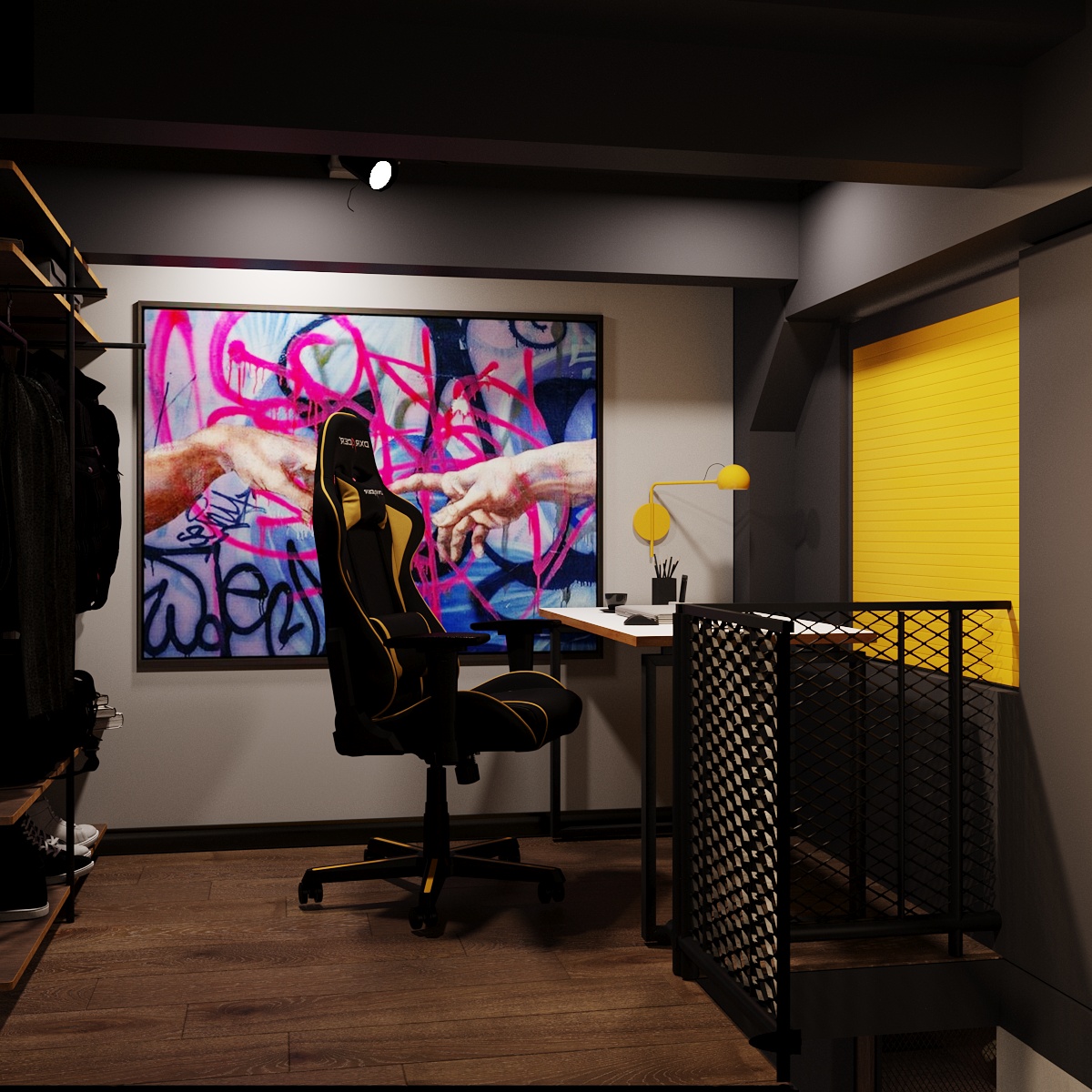 Ярким акцентом в интерьере стал насыщенный жёлтый цвет, который, как источник энергии и свежести, контрастирует с индустриальными материалами. В сочетании с бетоном и металлом, этот цвет оживляет пространство и придает ему динамичность.