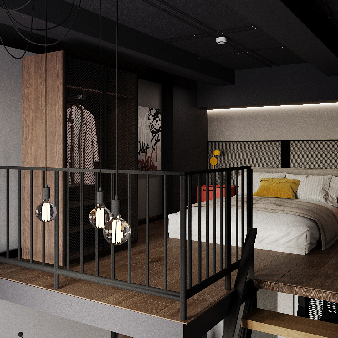 Умело использованные индустриальные элементы, такие как открытые трубопроводы и кирпичные стены, сочетаются с современными деталями, создавая уникальный баланс между холодной строгостью и живыми, тёплыми акцентами.