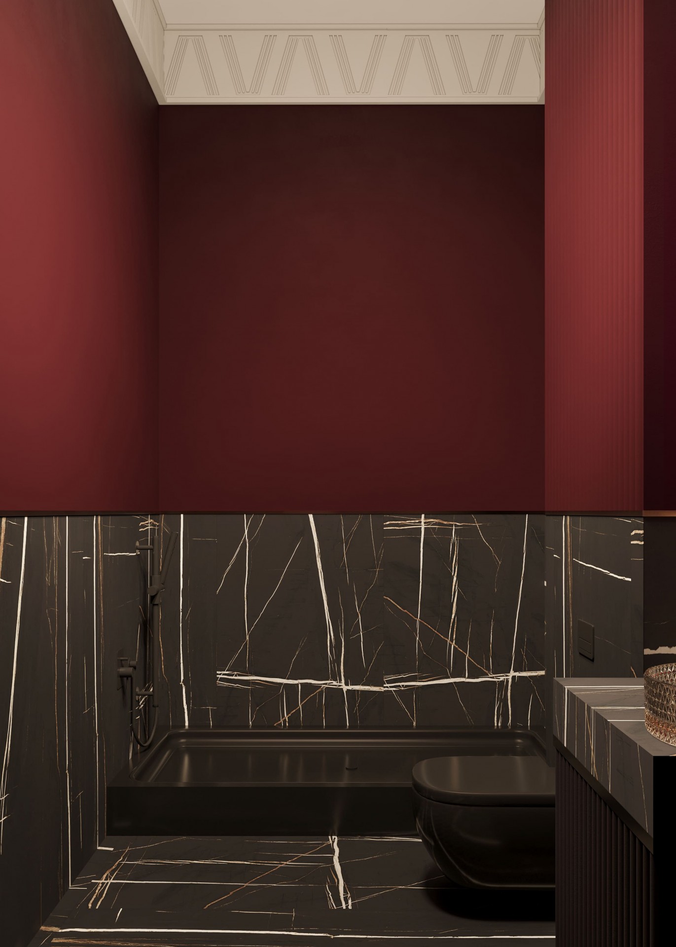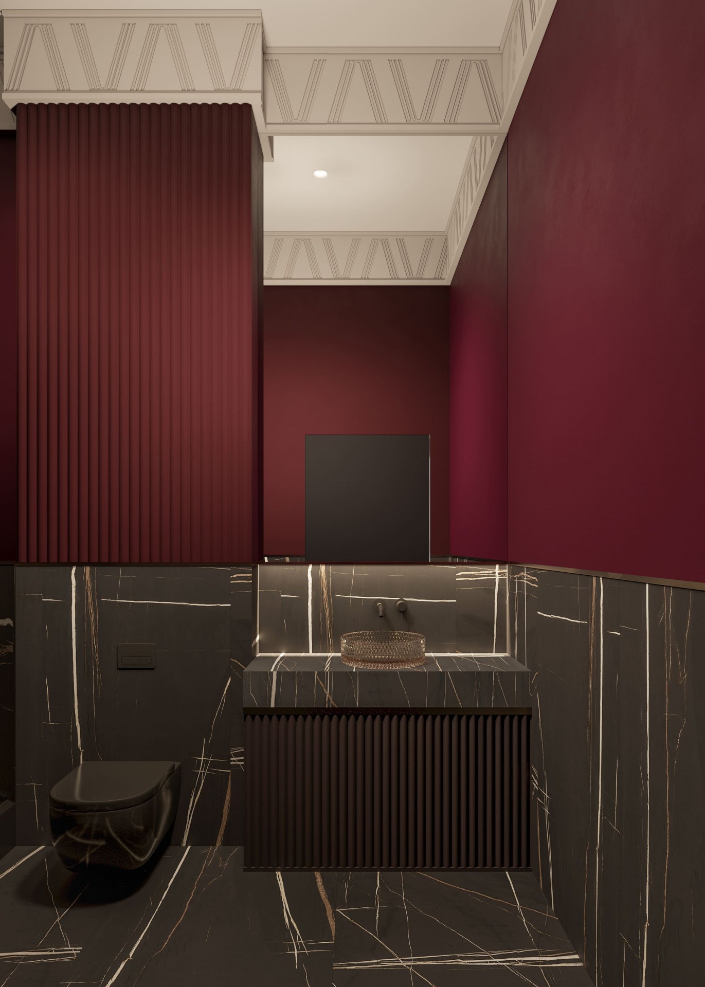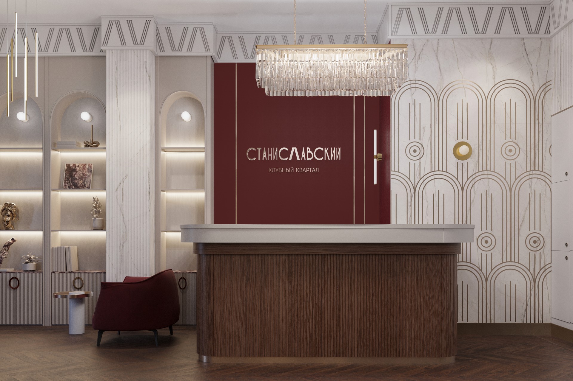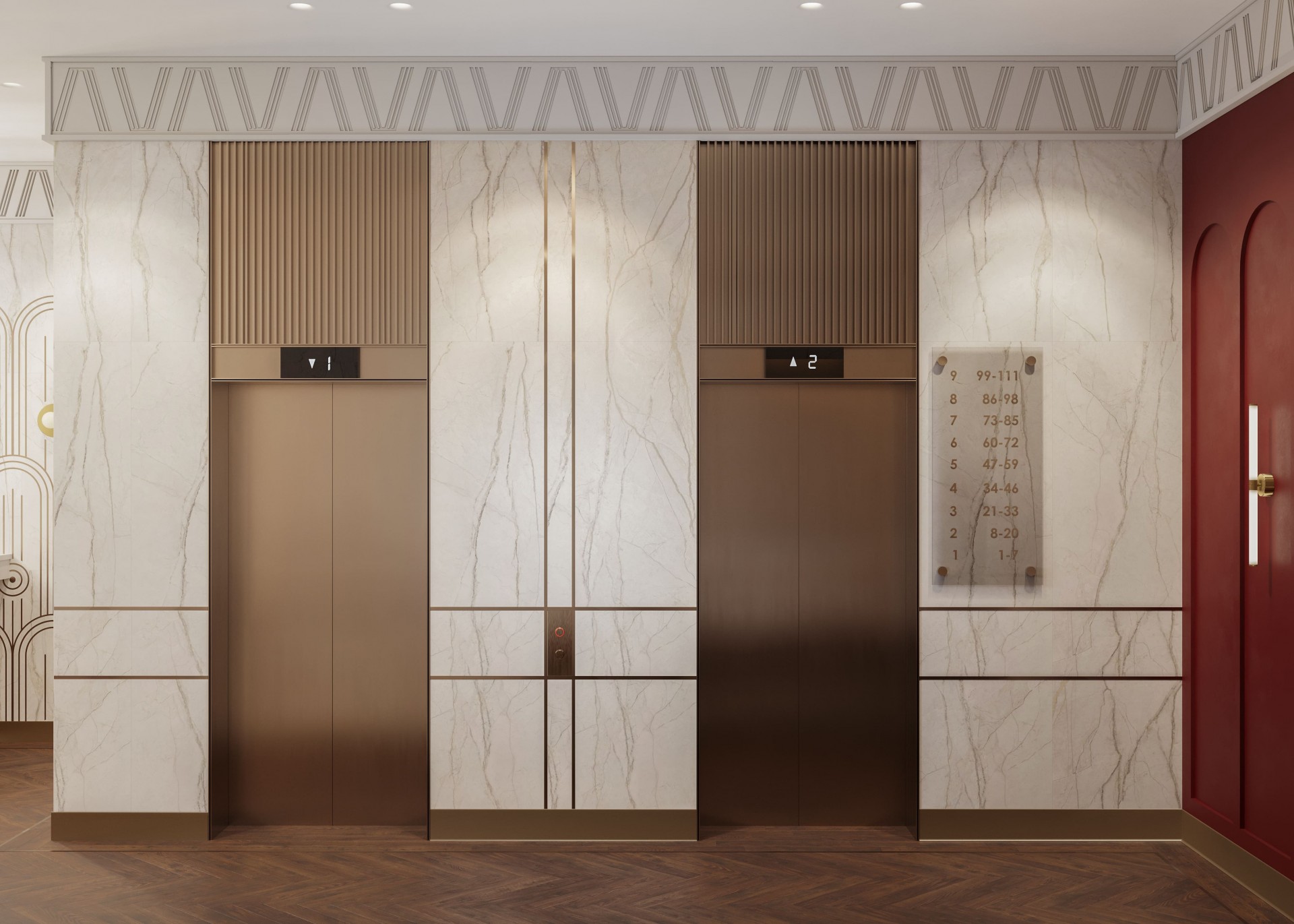 Дизайн-проект мест общего пользования жилого комплекса выдержан в изысканном стиле ар-деко, где каждая деталь подчеркивает статусность и премиальность пространства. Основные оттенки — глубокий красный Deep Red и благородный Gold — формируют яркий визуальный код, отражая характер комплекса и его уникальную атмосферу.