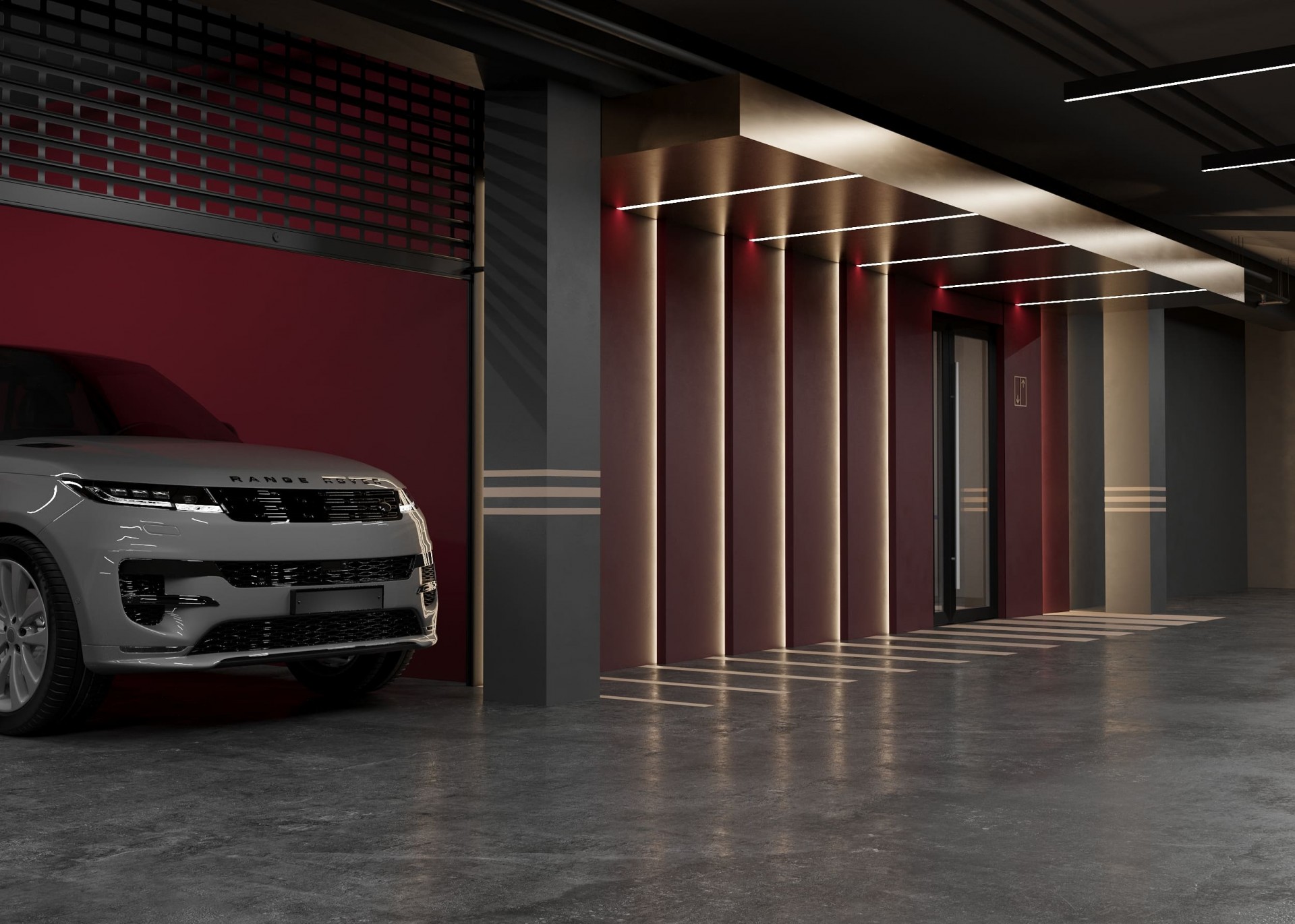 Подземный паркинг логично продолжает эстетику первых этажей. Входные группы оформлены с помощью света и цвета, что облегчает навигацию и формирует эффектную точку входа. Парковочные места можно объединять в индивидуальные «гаражи», что делает эксплуатацию удобнее и гибче.