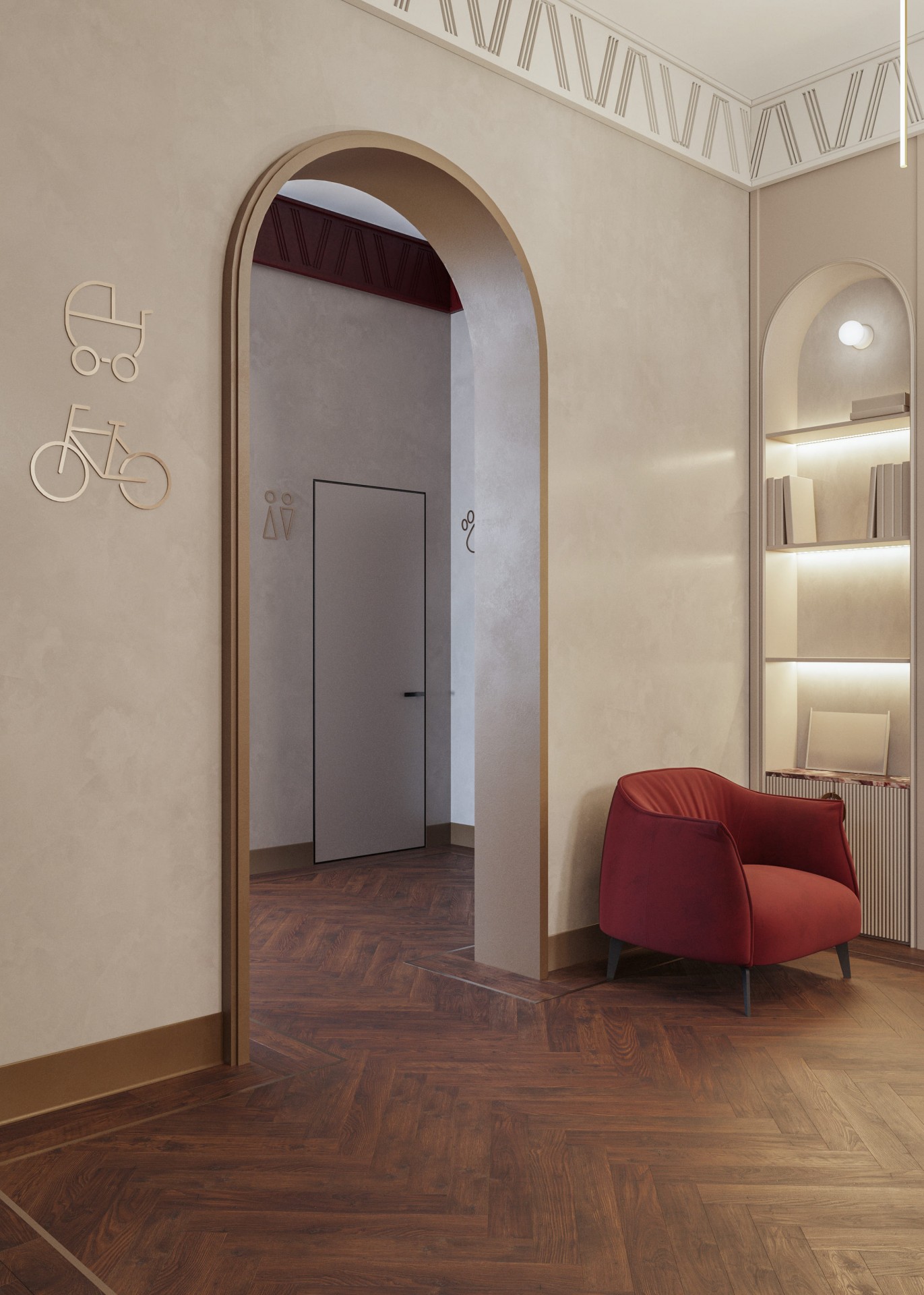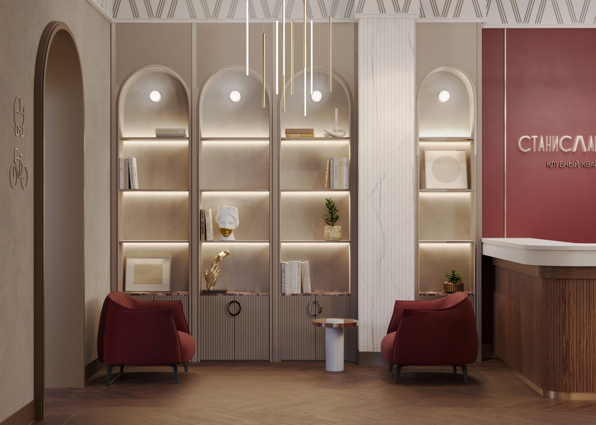 Арочные формы — один из характерных признаков ар-деко — интегрированы в интерьер как декоративные и функциональные элементы: ниши для мебели с подсветкой, зона буккроссинга, акцентные перегородки между холлом и помещением для хранения велосипедов и колясок.