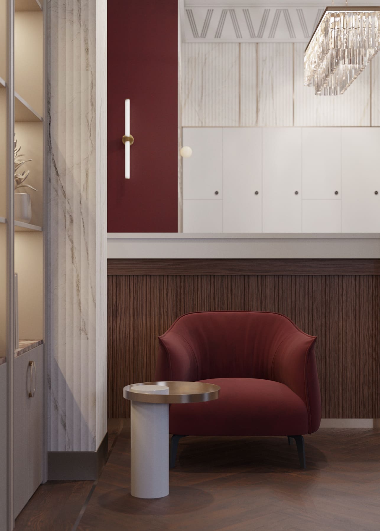Световые сценарии продуманы с особой тщательностью: от классических люстр и лаконичных гипсовых светильников до декоративной подсветки и бра, создающих особое настроение. Глубокий бордовый оттенок нашел отражение в мягкой мебели и оформлении стен, добавляя пространству выразительность, эмоциональную глубину и легкий драматизм.