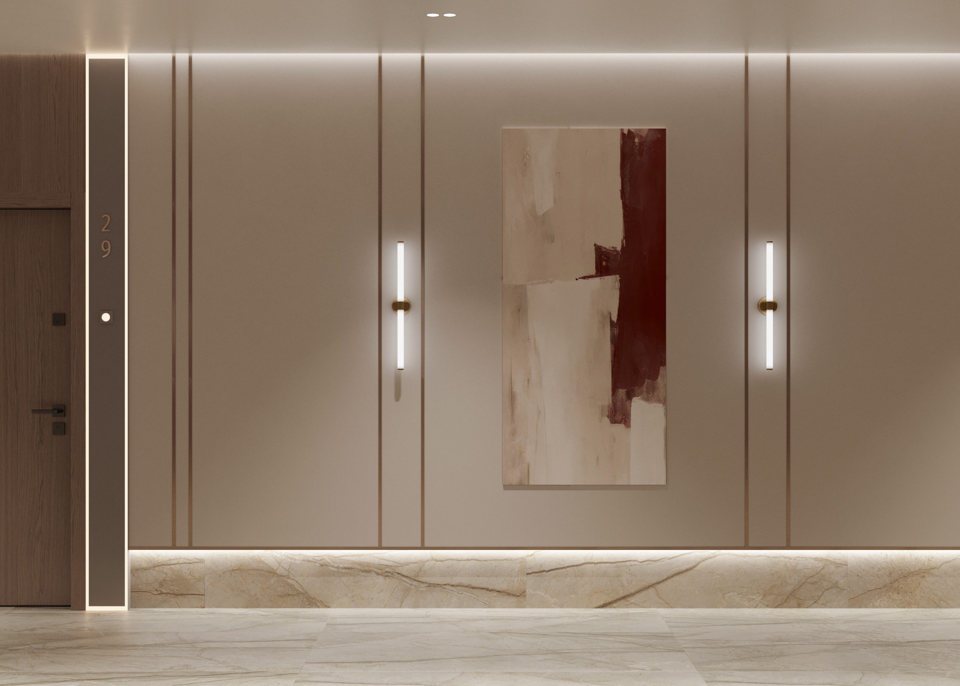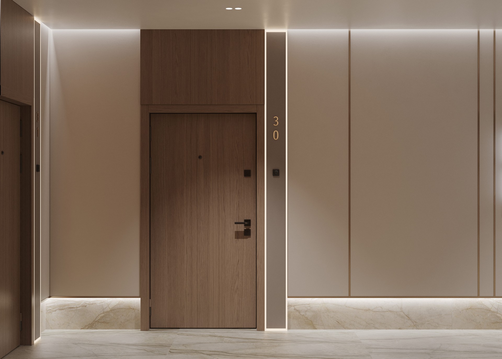 Типовые этажи поддерживают общую концепцию, но выполнены более сдержанно: в теплой гамме, с акцентом на выразительный рисунок камня, переходящего с пола на стены, подсветку, обрамление лифтовых порталов и текстуру натурального дерева на входных дверях.