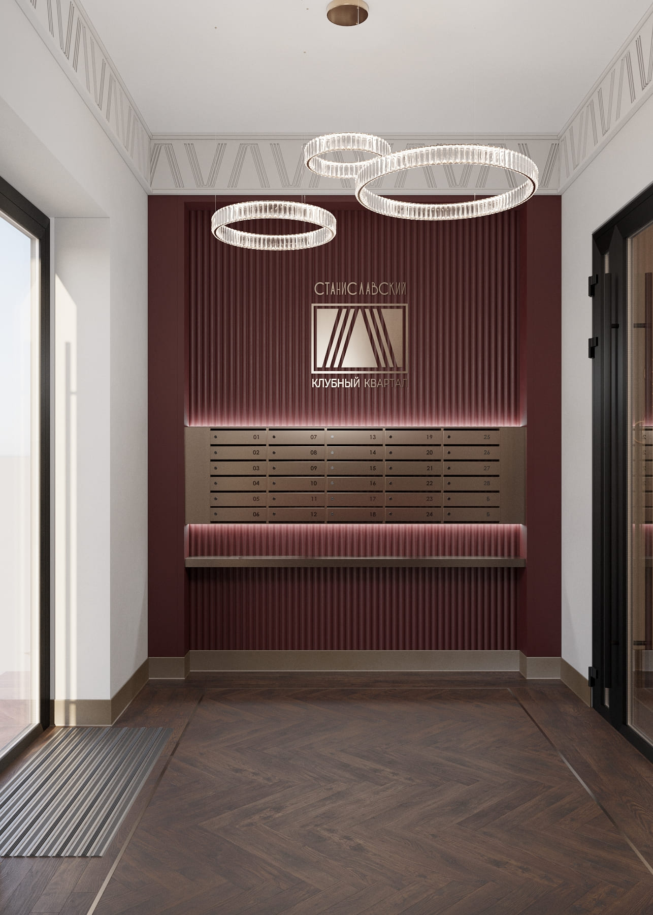 Особым акцентом проекта стала индивидуальная гипсовая лепнина с авторским паттерном на основе логотипа, использованная в зоне почтовых ящиков и лифтового холла. Фирменный мотив арок воплощён и в металлическом декоре ресепшн, органично продолжая архитектурную концепцию всего комплекса.